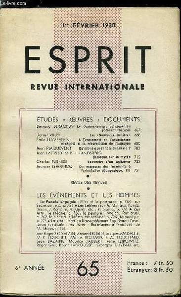Esprit n� 65 - Le comportement politique du patronat fran�ais par Bernard Serampuy, Les nouveaux cahiers par Daniel Villey, L'�crasement de l'anarchisme espagnol et la r�surrection de l'espagne par Emile Hambresin, Qu'est ce que l'individualisme ?