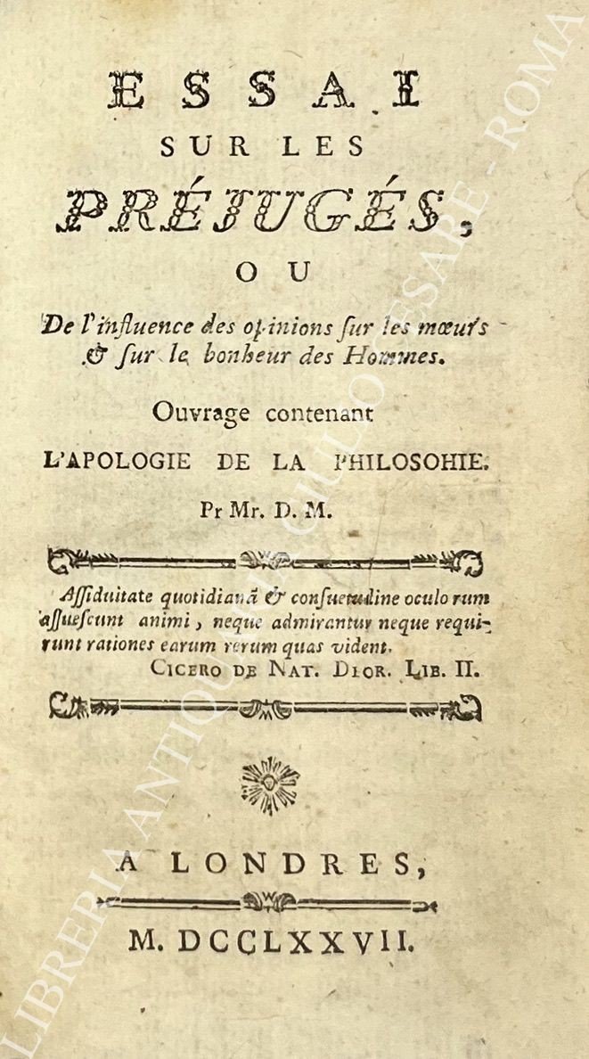 Essai sur les prejuges, ou De l'influence des opinions sur les moeur's & sur le bonheur des Hommes. Ouvrage contenant l'apologie de la philosohie | Libri antichi e moderni | Du Marfais