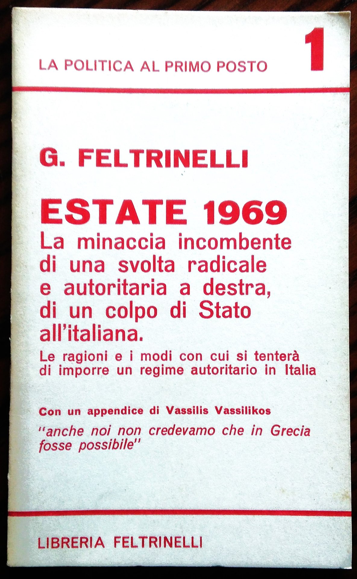 Estate 1969 La minaccia incombente di una svolta radicale e autoritaria a destra, di un colpo di Stato all'italiana. Le ragioni e i modi con cui si tenterà di imporre un regime autoritario in Italia. Con un'appendice di Vassilis Vassilikos 'Anche noi non credevamo che in Grecia fosse possibile'. | Libri antichi e moderni | Feltrinelli, Giangiacomo.