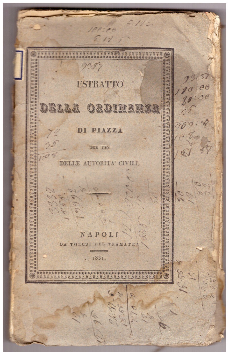 Un volume (14x23,5 cm) di 127 pagine; in barbe; una gora al margine basso delle prime pagine; una nota a penna al margine superiore della pagina di titolo. Brossura originale con titolo alla copertina, con molte usure ai margini, mancanze al dorso e numeri di antica mano a penna. Nonostante le mediocri condizioni, soprattutto all'esterno, questo volume è raro e riguarda il rapporto delle truppe «co' sindaci e con le autorità civili del regno».