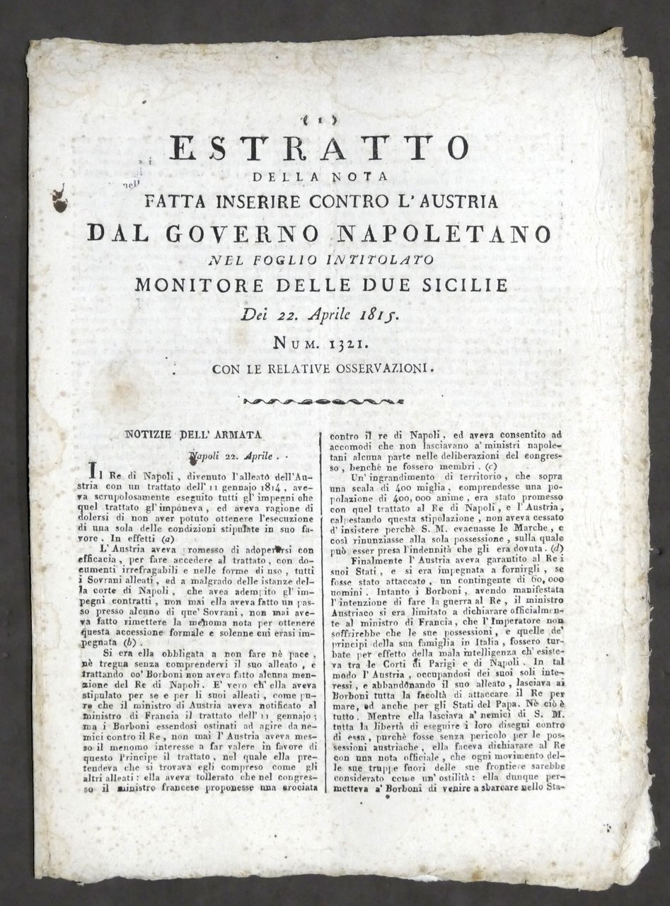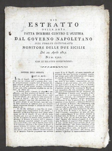 Estratto nota contro Austria dal Governo Napoletano - Notizie Armata - 1815 | Libri antichi e moderni |