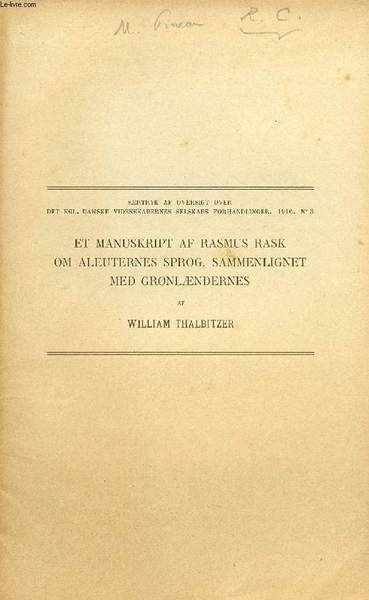 ET MANUSKRIPT AF RASMUS RASK OM ALEUTERNES SPROG. SAMMENLIGNET MED GR�NL�NDERNES | Libri antichi e moderni | Thalbitzer William