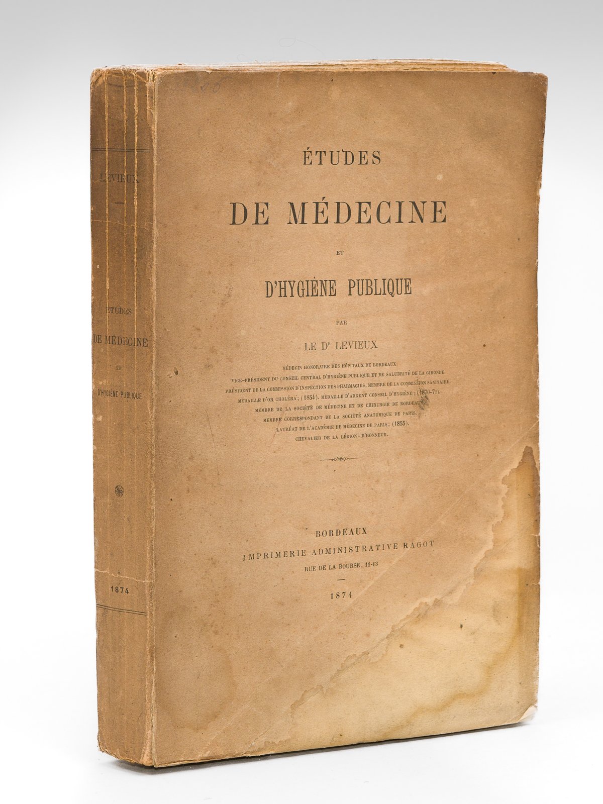 1 vol. grand in-8 br., Imprimerie Administrative Ragot, Bordeaux, 1874, XIII-563 pp. et 1 f. Envoi de l'auteur. Dédié au docteur Elie Gintrac, cet important ouvrage pour la connaissance de l'histoire médicale de la Gironde recueille divers travaux menés sur plus de 20 années, d'octobre 1852 à novembre 1873. Le Docteur Levieux évoque l'épidémie cholérique de 1849 en Gironde, l'industrie des sangsues en Gironde, l'influence de la culture du riz sur l'état sanitaire du canton de La Teste, la phtisie pulmonaire au pénitencier Saint-Jean, des études d'hygiène sur les marais de Belleville, les causes d'insalubrité à Bordeaux, une étude sur la rage, la prophylaxie du choléra en Gironde. Etat très satisfaisant (dos frotté, mouill. en couv., bon état par ailleurs)