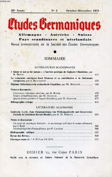 ETUDES GERMANIQUES, 28e ANNEE, N� 112, OCT.-DEC. 1973, ALLEMAGNE, AUTRICHE, SUISSE, PAYS SCANDINAVES ET NEERLANDAIS (Sommaire: �Aimer ce qui ne fut jamais� : l�univers po�tique de Sigbj�rn Obstfelder, par R. Boyer. Le romancier norv�gien Knut Hamsun.)