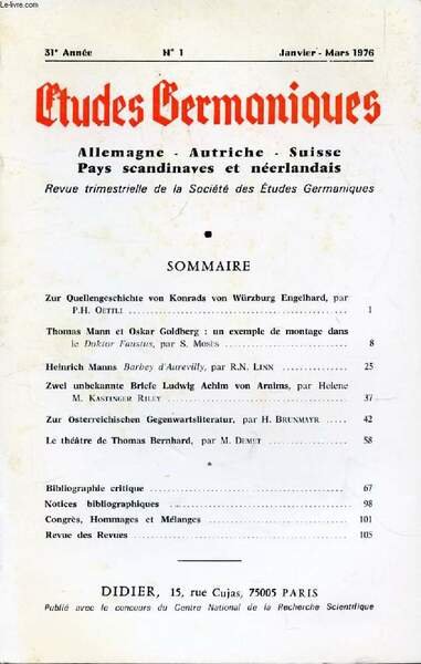ETUDES GERMANIQUES, 31e ANNEE, N� 121, JAN.-MARS 1976, ALLEMAGNE, AUTRICHE, SUISSE, PAYS SCANDINAVES ET NEERLANDAIS (Sommaire: Zur Quellengeschichte von Konrads von W�rzburg Engelhard, par P.H. Oettli. Thomas Mann et Oskar Goldberg : un exemple de.)