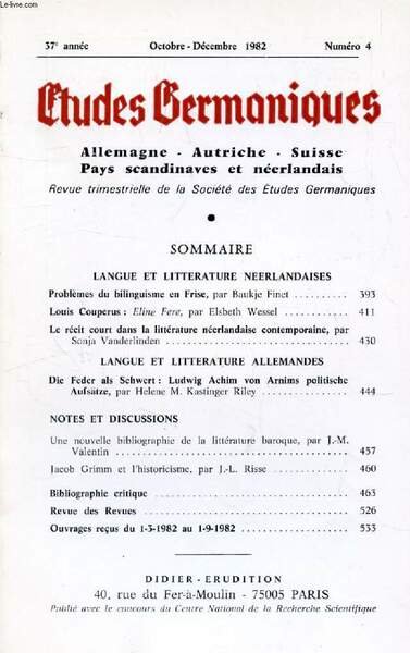 ETUDES GERMANIQUES, 37e ANNEE, N� 148, OCT.-DEC. 1982, ALLEMAGNE, AUTRICHE, SUISSE, PAYS SCANDINAVES ET NEERLANDAIS (Sommaire: Probl�mes du bilinguisme en Frise, par Baukje Finet. Louis Couperus : Eline Fere, par Elsbeth Wessel. Le r�cit court dans.) | Libri antichi e moderni | Collectif