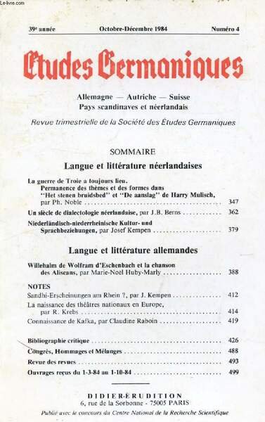 ETUDES GERMANIQUES, 39e ANNEE, N� 156, OCT.-DEC. 1984, ALLEMAGNE, AUTRICHE, SUISSE, PAYS SCANDINAVES ET NEERLANDAIS (Sommaire: Langue et litt�rature n�erlandaises. La guerre de Troie a toujours lieu. Permanence des th�mes et des formes dans.) | Libri antichi e moderni | Collectif
