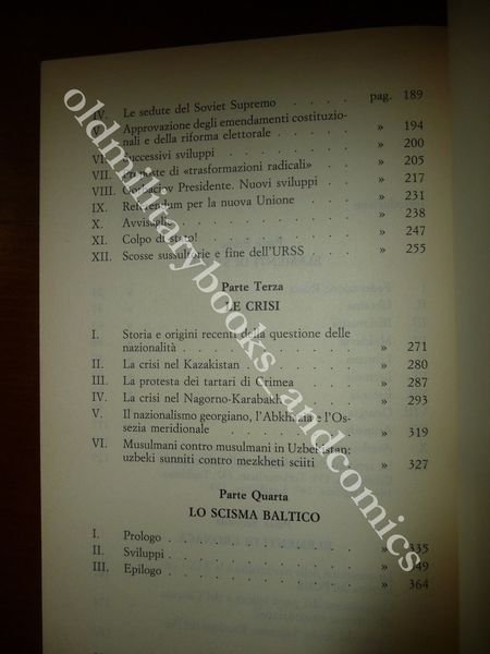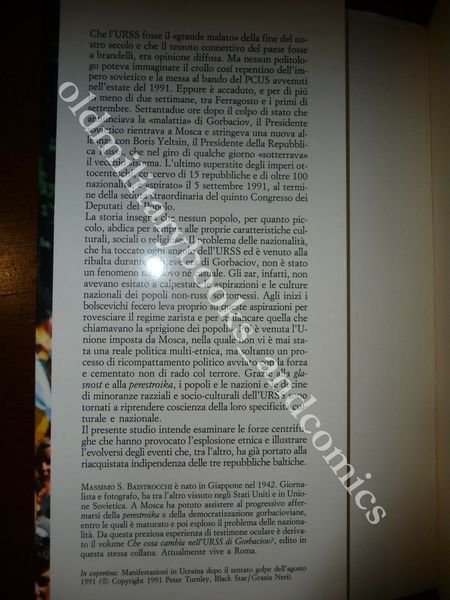 DESCRIZIONE: Mursia Ed. Milano 1995, br. ed. ill. con alette, pp. 390 in 8°. Il problema delle nazionalità, che ha toccato ogni angolo dell'URSS ed è venuto alla ribalta durante la breve era di Gorbaciov, non è un fenomeno né nuovo né casuale. Un'analisi storica dagli zar a Gorbaciov. Che l'URSS fosse il «grande malato» della fine del secolo scorso e che il tessuto connettivo del paese fosse a brandelli, era opinione diffusa. Ma nessuno poteva immaginare il crollo così repentino dell'impero sovietico e la messa al bando del PCUS avvenuti nell'estate del 1991. Il problema delle nazionalità, che ha toccato ogni angolo dell'URSS ed è venuto alla ribalta durante la breve era di Gorbaciov, non è un fenomeno né nuovo né casuale. Il presente studio intende esaminare le forze centrifughe che hanno provocato l'esplosione etnica e illustrare l'evolversi degli eventi che, tra l'altro, ha subito portato alla riacquistata indiependenzadelle tre repubbliche baltiche. Indice completo in foto. CONDIZIONI: Ottime/Perfette. PESO / WEIGHT: 370 gr. without package