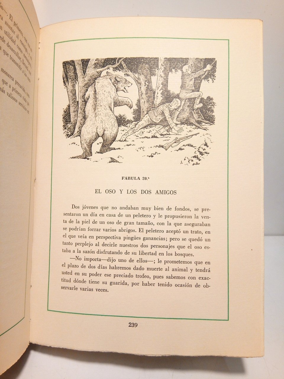 Edición Limitada y numerada.- Madrid: [s. n.] Imp. Afrodisio Aguado, S. A., 1946.- 575 p., [2 h.]: Preciosas ilustraciones encabezando cada fábula; 4º (25 x 19,5 cm); Magnifica impresión sobre excelente y fuerte papel de hilo verjurado de la Casa Guarro, texto recuadrado con filete en color verde; Encuadernado en Plena Piel, lomo cuajado en oro, cantos y contracantos con rueda dorada, Planchas doradas en ambos planos o tapas.- Edición limitada de 500 ejemplares numerados, siendo el nuestro ejemplar el Nº 283.- RARO.* Excelente estado. LITERATURA Y ESTUDIOS LITERARIOS EXTRANJEROS DE LOS SIGLOS XVI-XXI