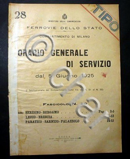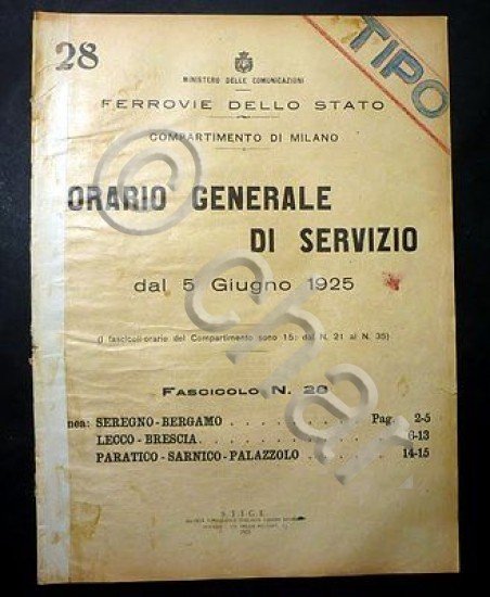 *** Ferrovie dello Stato - Orario Generale di Servizio dal 5 Giugno 1925 - Fascicolo n° 28 - Linea Seregno - Bergamo ; Lecco - Brescia ; Paratico - Sarnico - Palazzolo - pp. 15. Copia originale utilizzata come supporto per modifiche e correzioni apportate a matita come da foto Dimensioni: 24 x 33 cm ca. Per appassionati studiosi e collezionisti