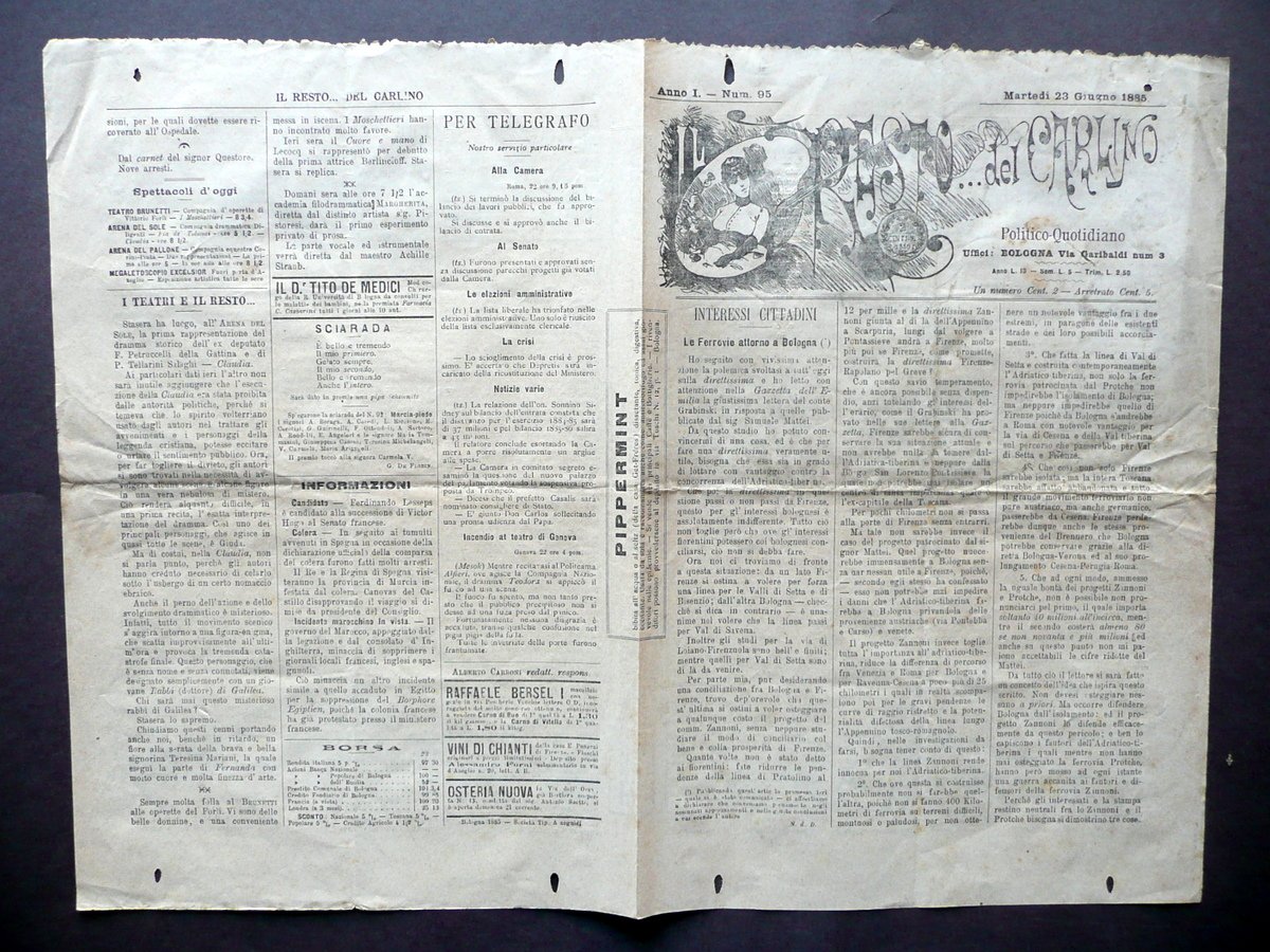 Ferrovie Intorno a Bologna Il Resto del Carlino Anno I Numero 95 23/6/1885 | Libri antichi e moderni |