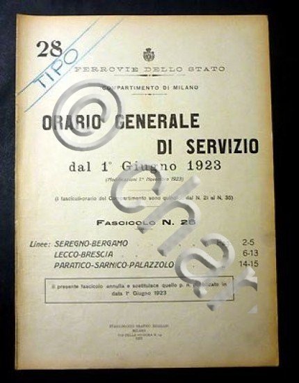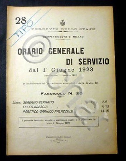 *** Ferrovie dello Stato - Orario Generale di Servizio dal 1 Giugno 1923 - Fascicolo n° 28 - Linea Seregno - Bergamo ; Lecco - Brescia ; Paratico - Sarnico - Palazzolo - pp. 15. Copia originale utilizzata come supporto per modifiche e correzioni apportate a matita come da foto. Dimensioni: 24 x 33 cm ca. Per appassionati studiosi e collezionisti