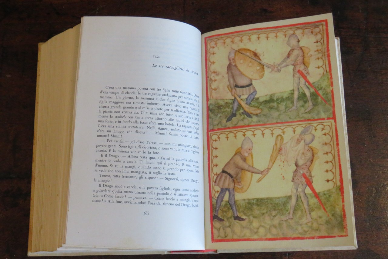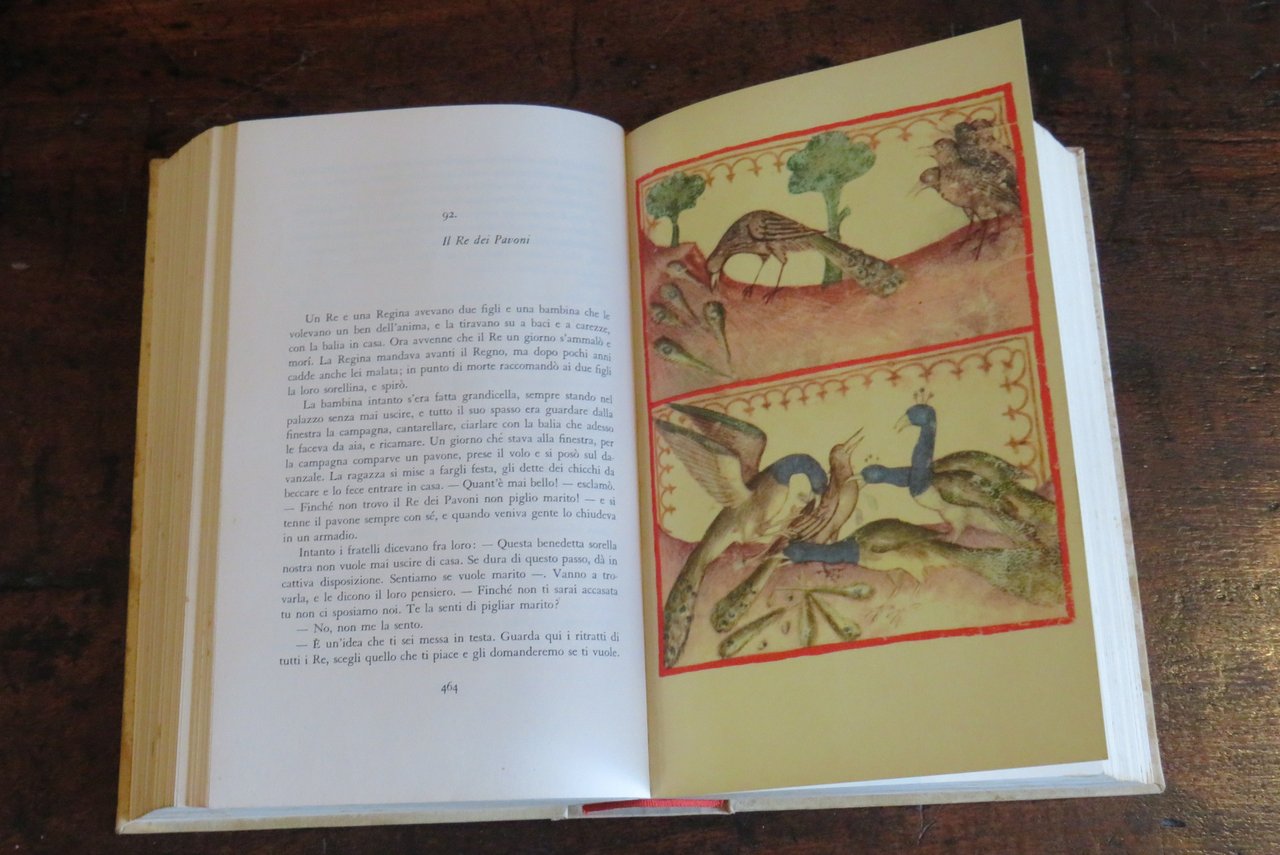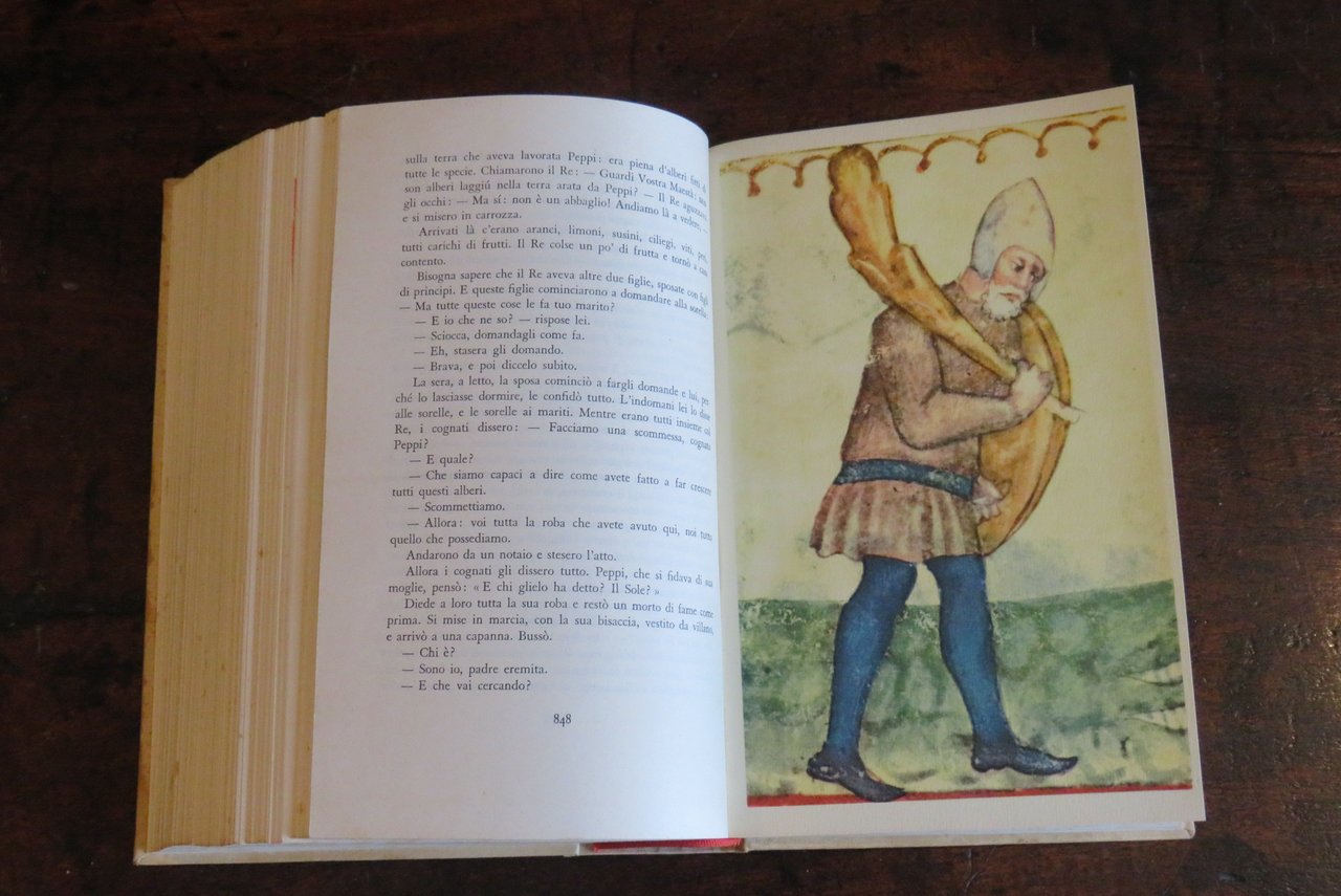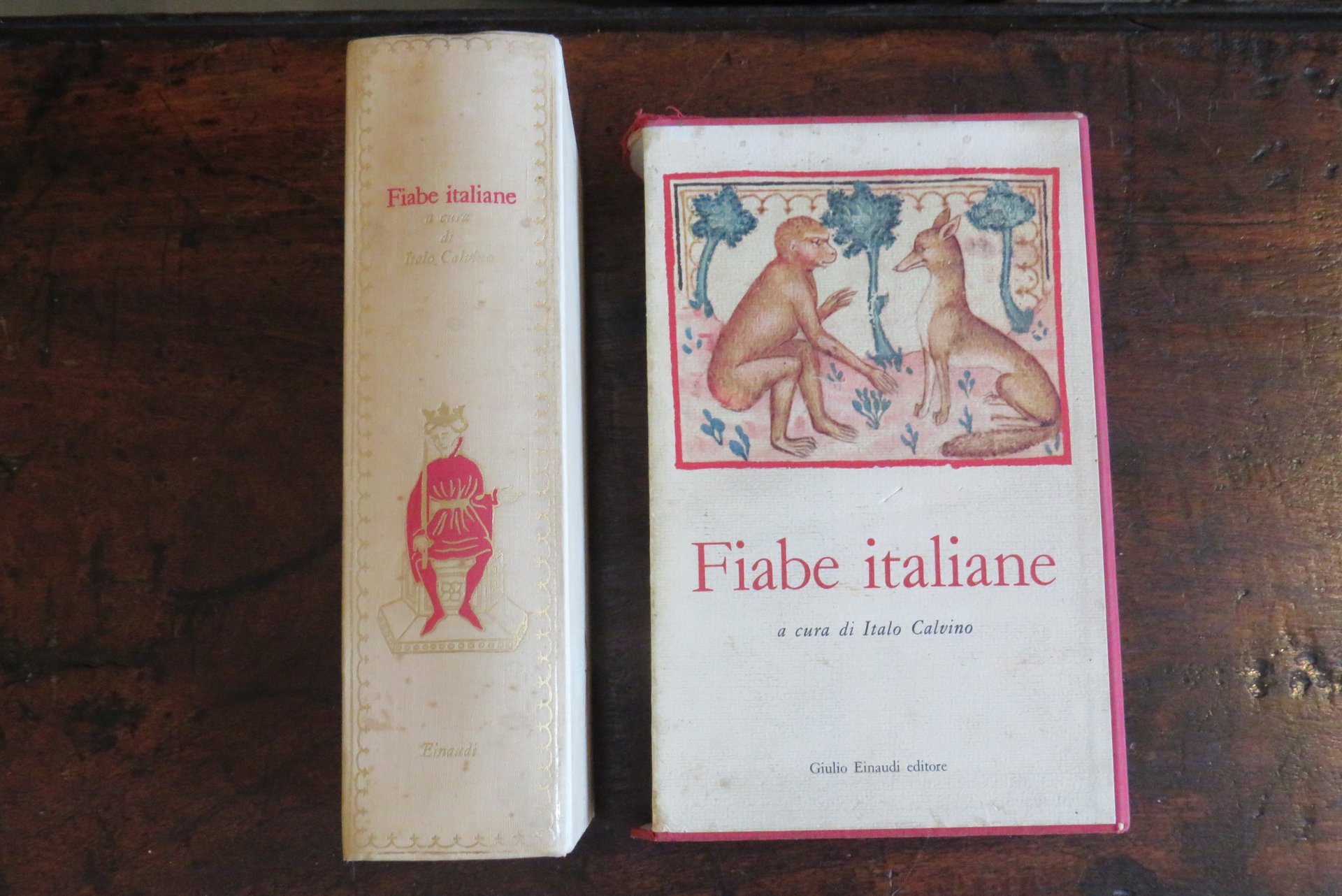 Torino, Giulio Einaudi editore, 1956. In -8 (mm. 140x220), pp. XLVIII, 1037 (1), con 16 splendide tavole illustrate a colori al recto, fuori testo, di cui una all’antiporta, a cura di G. Bollati. Legatura editoriale tutta tela, con dorso e piatto anteriore illustrati in rosso, nero e oro. Le tavole sono "tratte da miniature di un codice di favole trecentesco, di gusto fantastico e popolare". Celebre raccolta antologica di 200 fiabe tratte dalla tradizione popolare italiana. Introduzione dell’autore (pp. XV- XLVIII). Note (pp. 979-1031). Collana "I millenni" n. 33. Conservato in cofanetto editoriale di cartone e tela illustrato a colori al piatto anteriore e posteriore. Prima edizione. Lievi stropicciamenti della carta alle pp. 55-58. Macchie sparse, ma lievi, sulla copertina, sul taglio inferiore e laterale, sul cofanetto, ma che non pregiudicano il testo. Nell’insieme ottimo esemplare.