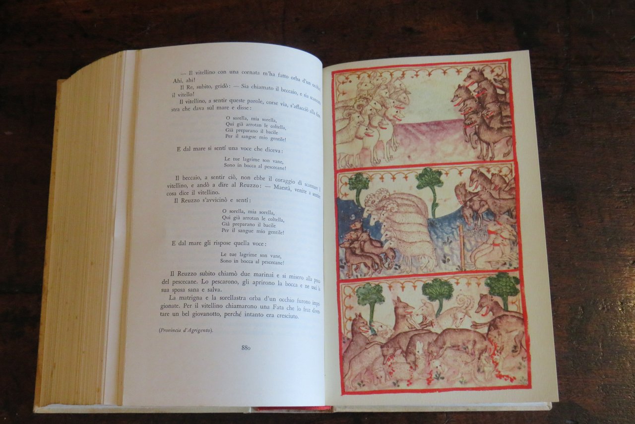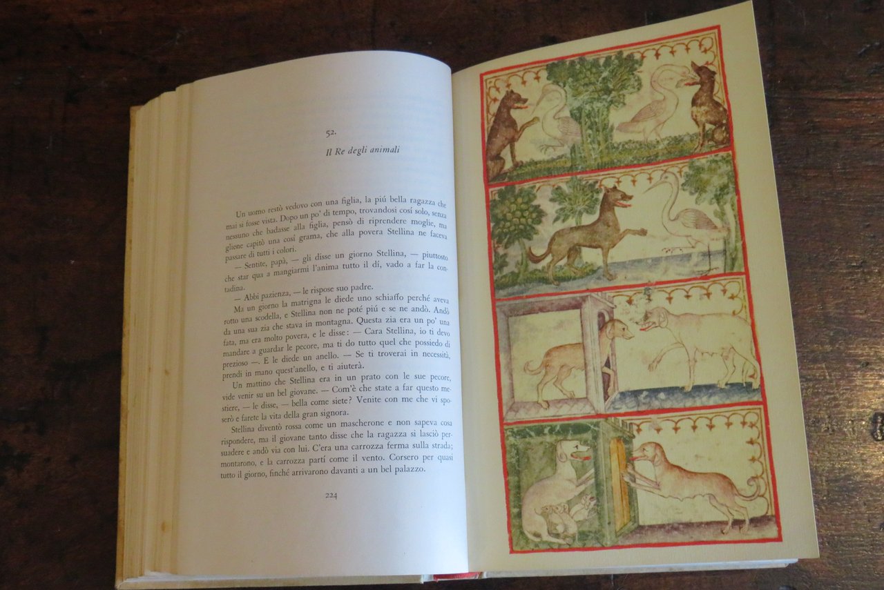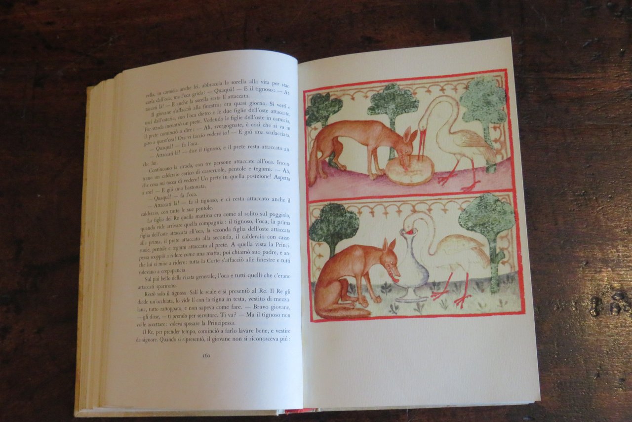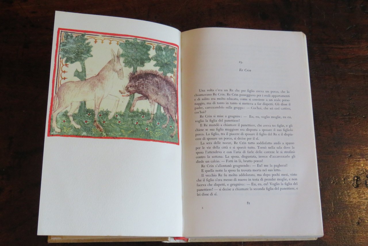 Torino, Giulio Einaudi editore, 1956. In -8 (mm. 140x220), pp. XLVIII, 1037 (1), con 16 splendide tavole illustrate a colori al recto, fuori testo, di cui una all’antiporta, a cura di G. Bollati. Legatura editoriale tutta tela, con dorso e piatto anteriore illustrati in rosso, nero e oro. Le tavole sono "tratte da miniature di un codice di favole trecentesco, di gusto fantastico e popolare". Celebre raccolta antologica di 200 fiabe tratte dalla tradizione popolare italiana. Introduzione dell’autore (pp. XV- XLVIII). Note (pp. 979-1031). Collana "I millenni" n. 33. Conservato in cofanetto editoriale di cartone e tela illustrato a colori al piatto anteriore e posteriore. Prima edizione. Lievi stropicciamenti della carta alle pp. 55-58. Macchie sparse, ma lievi, sulla copertina, sul taglio inferiore e laterale, sul cofanetto, ma che non pregiudicano il testo. Nell’insieme ottimo esemplare.