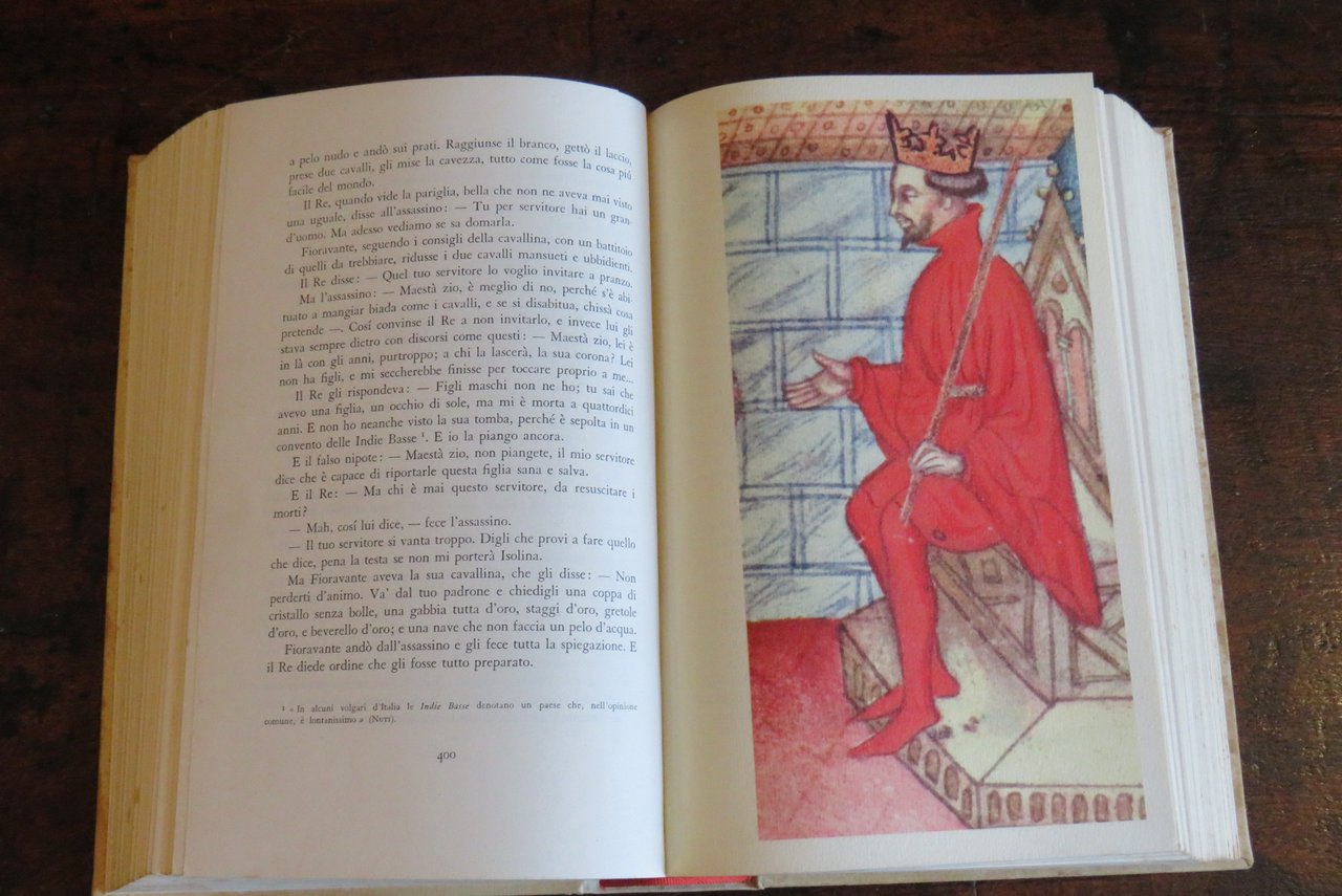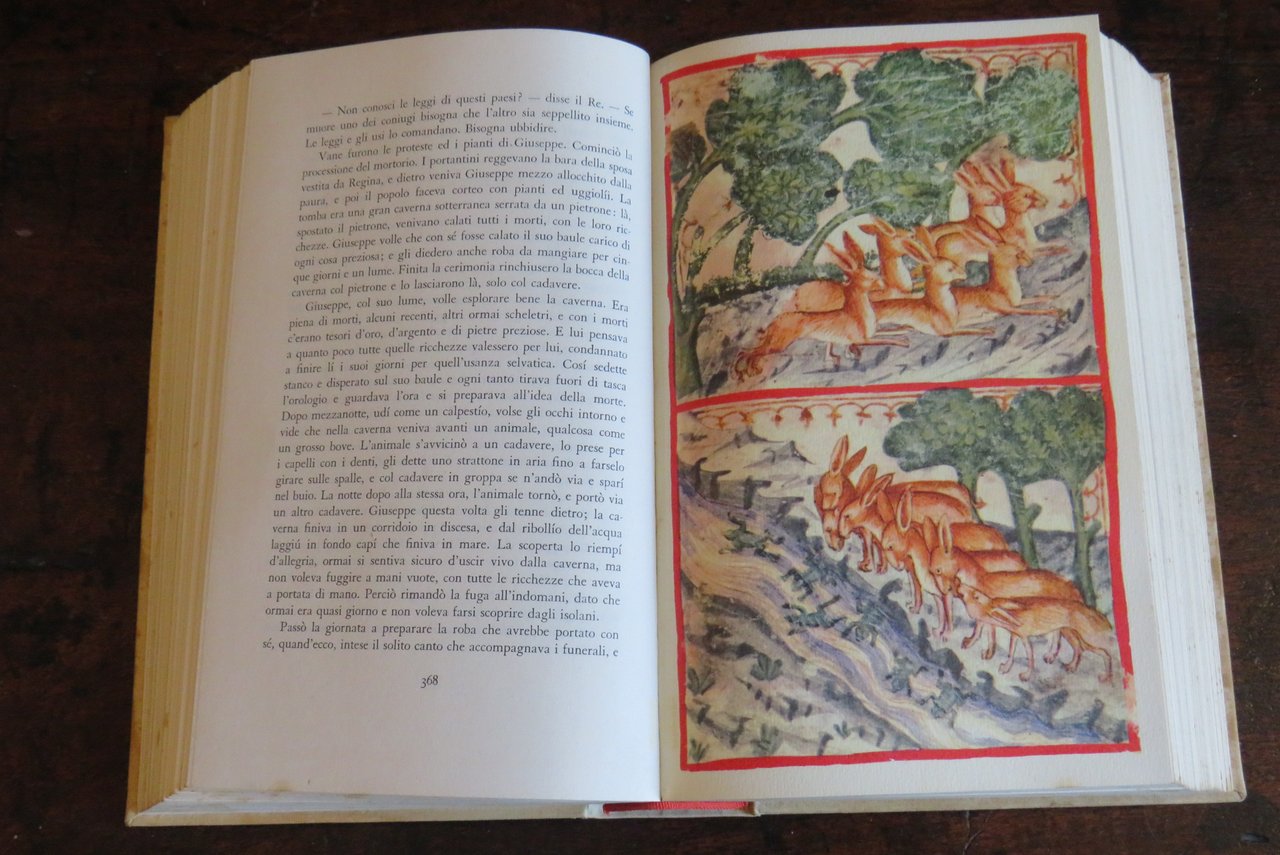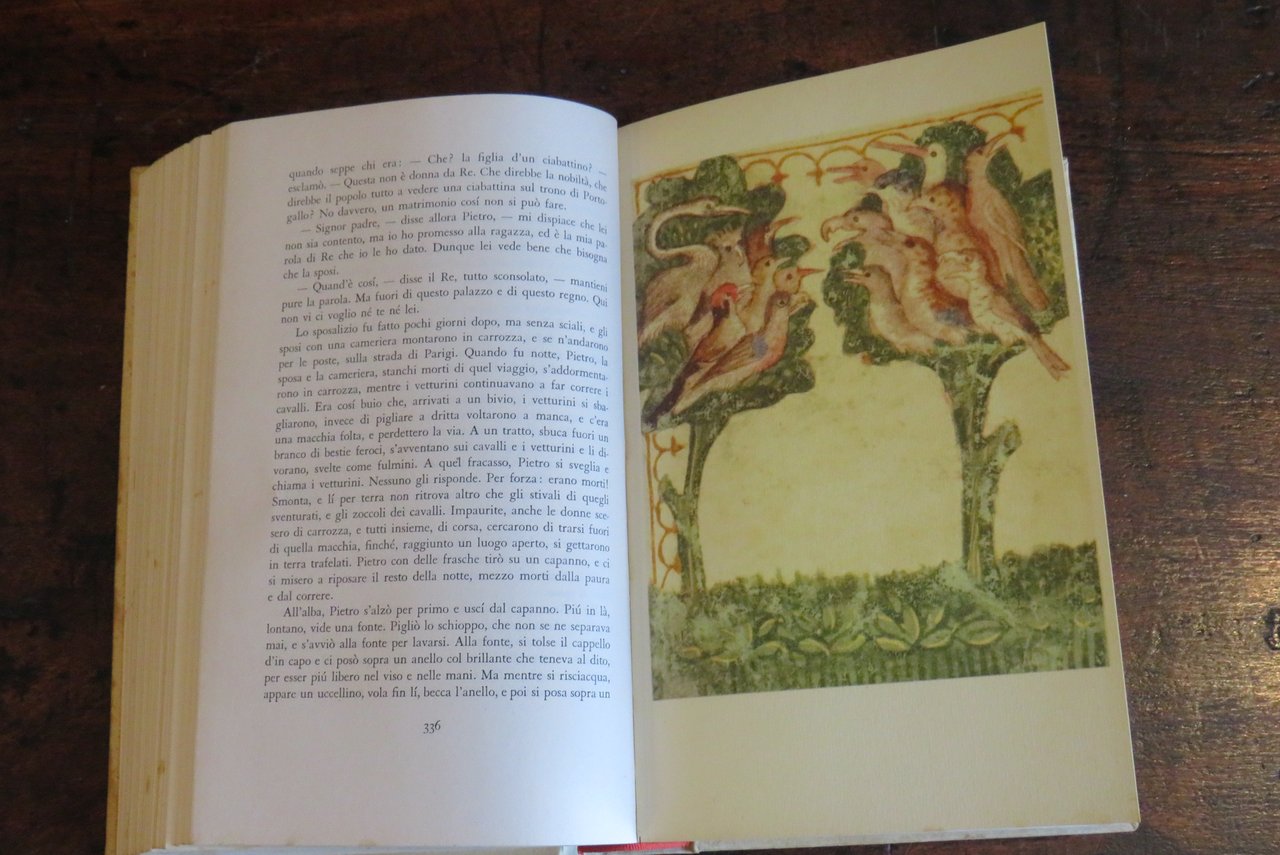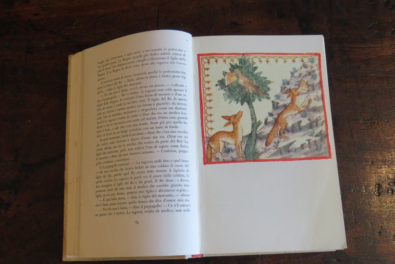 Torino, Giulio Einaudi editore, 1956. In -8 (mm. 140x220), pp. XLVIII, 1037 (1), con 16 splendide tavole illustrate a colori al recto, fuori testo, di cui una all’antiporta, a cura di G. Bollati. Legatura editoriale tutta tela, con dorso e piatto anteriore illustrati in rosso, nero e oro. Le tavole sono "tratte da miniature di un codice di favole trecentesco, di gusto fantastico e popolare". Celebre raccolta antologica di 200 fiabe tratte dalla tradizione popolare italiana. Introduzione dell’autore (pp. XV- XLVIII). Note (pp. 979-1031). Collana "I millenni" n. 33. Conservato in cofanetto editoriale di cartone e tela illustrato a colori al piatto anteriore e posteriore. Prima edizione. Lievi stropicciamenti della carta alle pp. 55-58. Macchie sparse, ma lievi, sulla copertina, sul taglio inferiore e laterale, sul cofanetto, ma che non pregiudicano il testo. Nell’insieme ottimo esemplare.