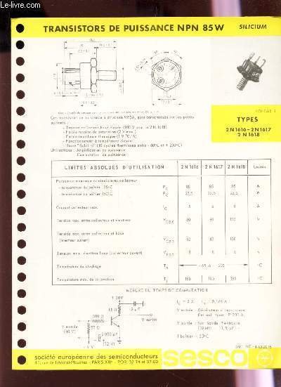 FICHE TECHNIQUE : TRANSISTORS DE PUISSANCE NPN 85W - SILICIUM / TYPES 2N 1616 - 2N 1617 - 2N 1618.