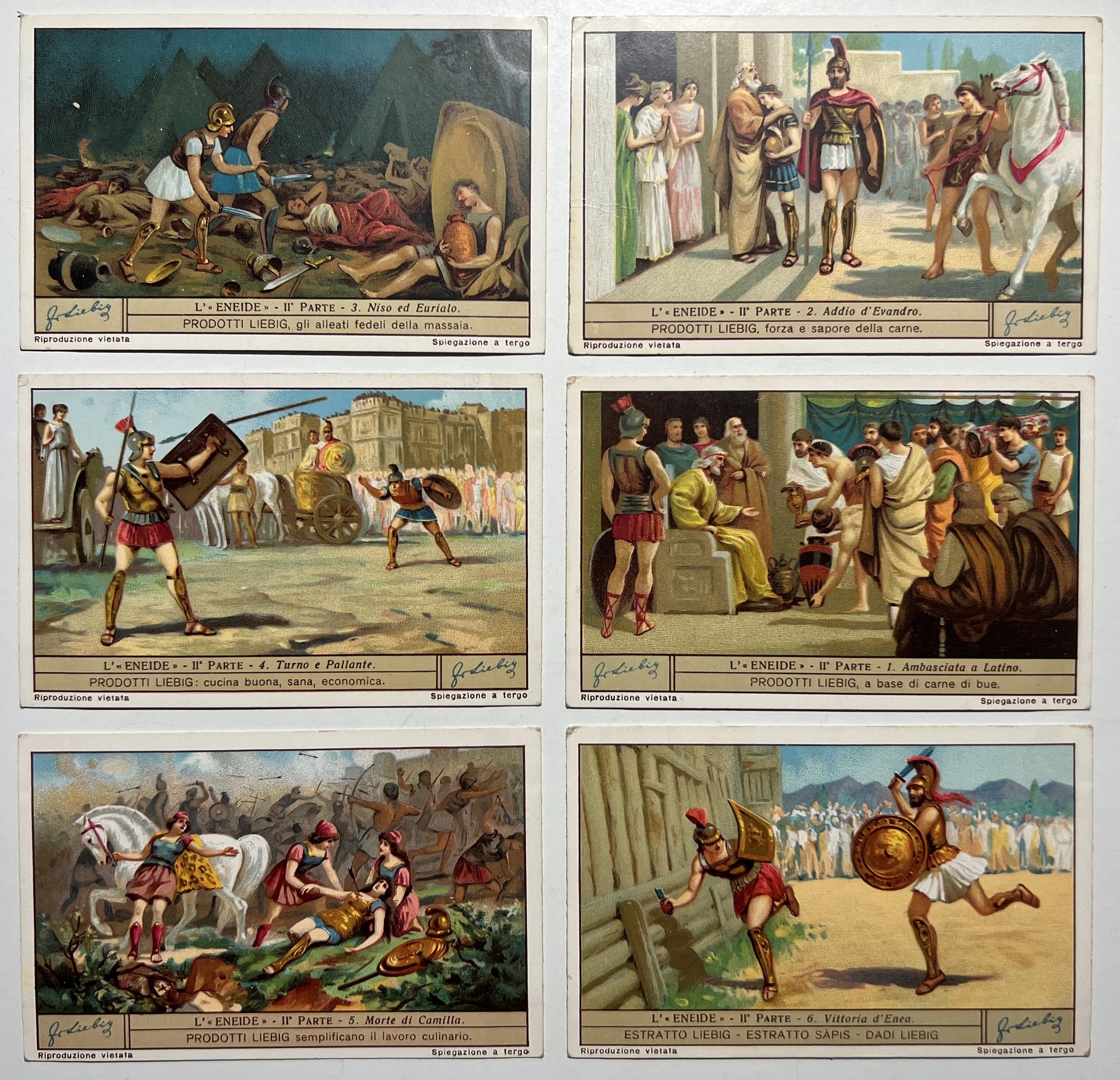 Figurine LIEBIG - L'Eneide, II^ Parte - Rif. N° 1239 - 6 Figurine La numerazione fa riferimento al Catalogo Sanguinetti. Condizioni molto buone con piccoli segni del tempo come da foto. FOTOGRAFIE DEL RETRO A RICHIESTA.