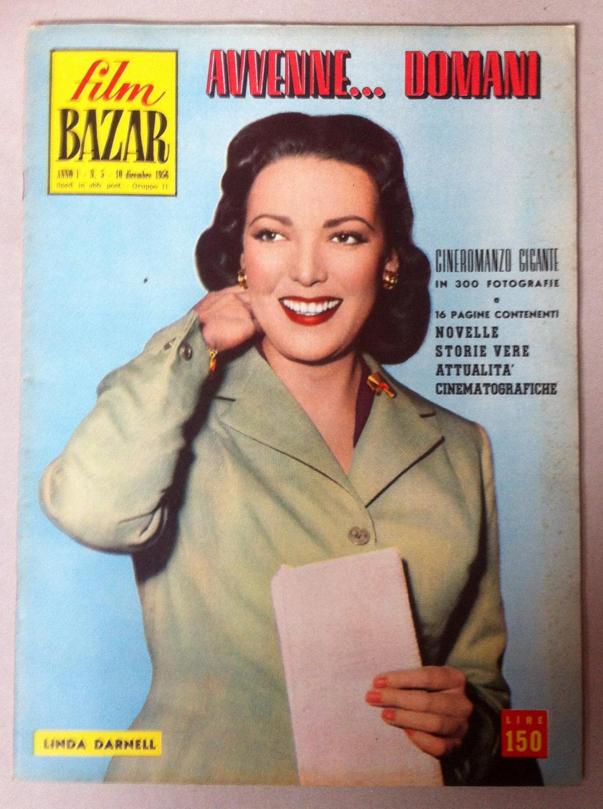 FILM BAZAR AVVENNE.DOMANI LINDA DARNELL DICK POWELL JACK DAKIE N. 5 1956 CINEROMANZO GIGANTE N. 5 10 DICEMBRE 1956, LIEVI ALONI E LEGGERE FIORITURE AL PIATTO ANTERIORE, IN BUONO STATO TAGLI BRUNITI, N. PAG. 66 CM. 38,5 X 24,5 SIGLA DI POSSESSO ALL'ULTIMA PAGINA