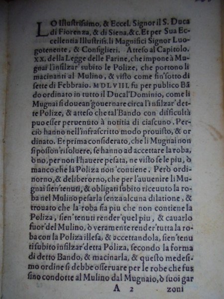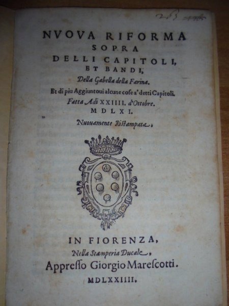 Bandi. NUOVA RIFORMA delle Capitoli et Bandi, della gabella della farina. Et in più aggiuntovi alcune cose a' detti Capitoli. Fatta a dì 24 d' Ottobre 1561. Nuovamente ristampata. In Fiorenza, appresso Giorgio Marescotti, 1574. In-4° antico, cop. in varese bruna. (8) pp. Arme ducale nel front. Opuscolo. Pac. 3 Uff. Mob. 3