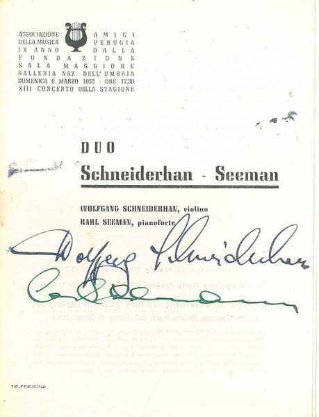 Firma autografa dei due musicisti alla copertina del programma di sala del concerto (6 marzo 1955) per l'Associazione Amici della Musica di Perugia | Libri antichi e moderni | Schneiderhan Wolfgang (Musicista, 1915-2002), Seeman Karl (Music, Ista, 1910-1983)