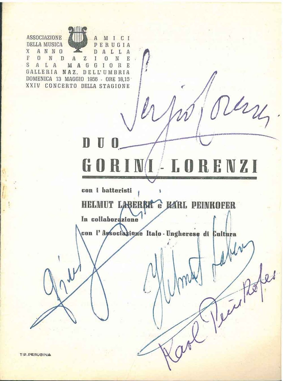 Firma autografa dei musicisti alla copertina del programma di sala del concerto svoltosi il 13 maggio 1956 per l'Associazione Amici della Musica di Perugia | Libri antichi e moderni | Gorini, Gino, Lorenzi Sergio, Laberer Helmut, Peinkofer Karl