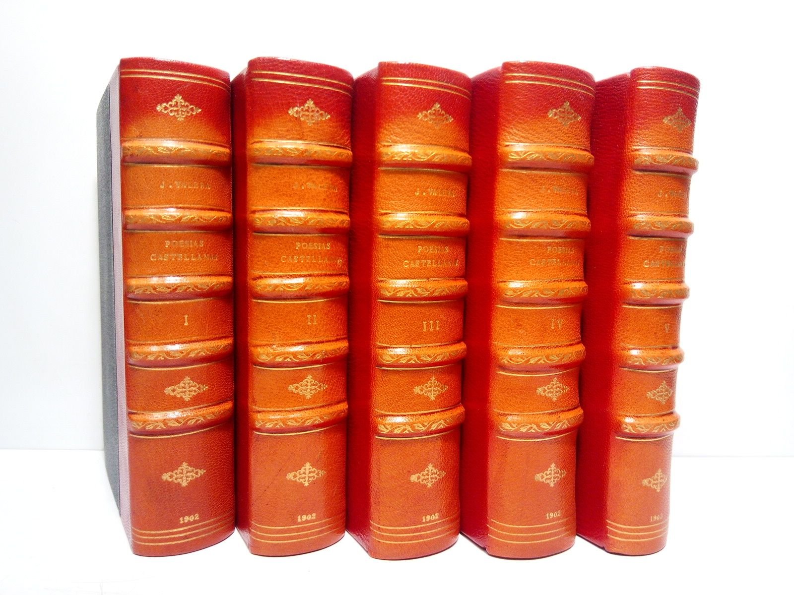 [PRIMERA EDICION].- Madrid: Librería de Fernando Fé, 1902-1903.- 5 Vols. (XV,380; 384; 384; 447; 340 pp.); 8º menor (16,3 x 10,5 cm); Parcialmente intonso; Media Piel Chagrén Nueva.- En la obra, Valera nos ofrece una erudita selección de nuestra poesía del XIX. El tomo primero es una magistral introducción y estudio a la poesía hispana, el último, esta constituido por los bosquejos biográficos de gran cantidad de nuestros poetas, muchos de ellos muy poco estudiados incluso hoy en día.* Excelente estado. LITERATURA Y FILOSOFÍA ESPAÑOLAS DE LOS SIGLOS XIX-XXI Y SU HISTORIA EN GENERAL