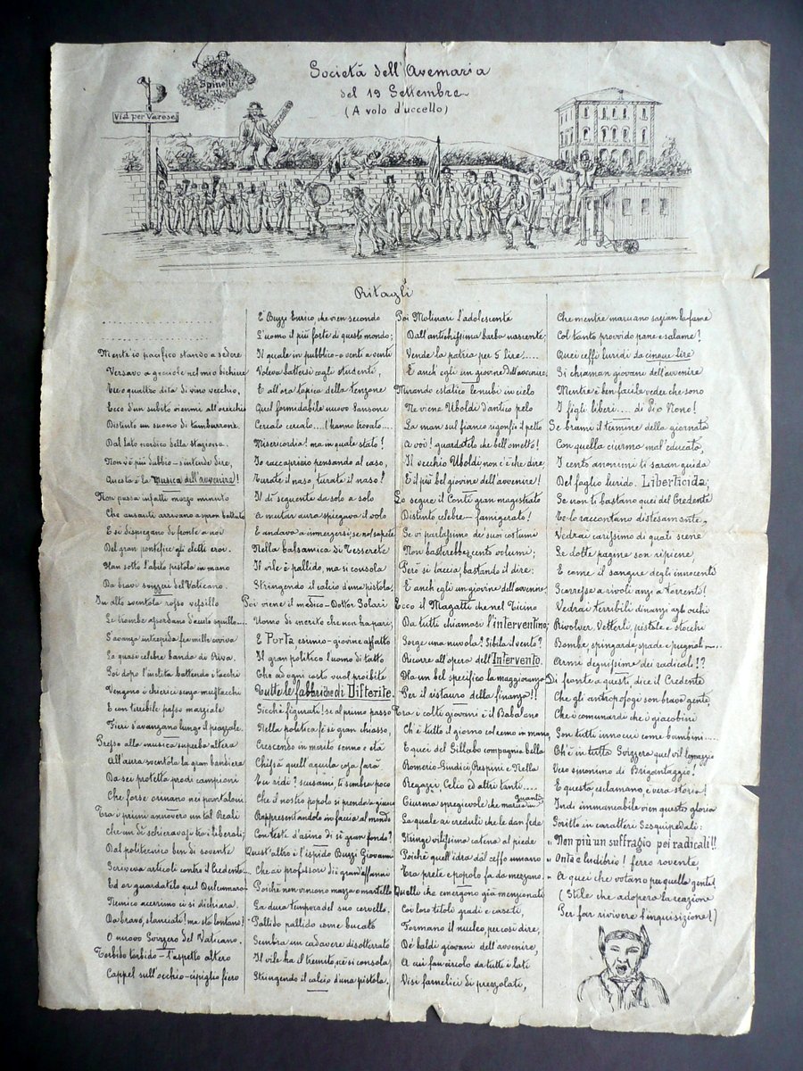Foglio popolare, Società dell'Avemaria del 19 Settembre (a volo d'uccello) - Ritagli" Senza dati tip., s. d. (fine Ottocento circa); foglio popolare a stampa su carta, con una ill. in b/n al margine sup. e una, di piccole dimensioni, al margine inf.; testo a caratteri manoscritti disposto su quattro colonne. Cm 41x30. Condizioni di conservazione Esemplare complessivamente ben conservato con tracce d'uso, pieghe di conservazione, alcune piccole leggerissime bruniture; margini e angoli con qualche piccolo strappetto e traccia di pieghetta; alcune minuscole irregolarità (vedi foto). Foglio popolare satirico in rima, nel quale si narra di una colonna di Guardie Svizzere e di prelati che scortano sei prigionieri, tutti indicati come facenti parte della corrente liberale. Contenuto fortemente antiliberale. SC03.D11903 N "