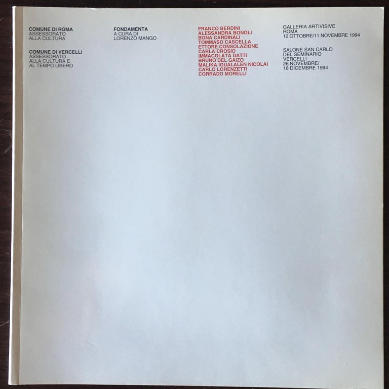 Catalogo di mostra, Galleria ArtiVisive, Roma, 12 ottobre - 11 novembre 1994; Salone San Carlo Del Seminario, Vercelli, 26 novembre - 18 dicembre 1994. Tavole in bianco e nero e colori (opere di Franco Berdini, Alessandra Bonoli, Bona Cardinali, Tommaso Cascella, Ettore Consolazione, Carla Crosio, Immacolata Datti, Bruno del Gaizo, Malika Ioualalen Nicolai, Carlo Lorenzetti, Corrado Morelli . 8vo. pp. 36. . Molto buono (Very Good). . . .