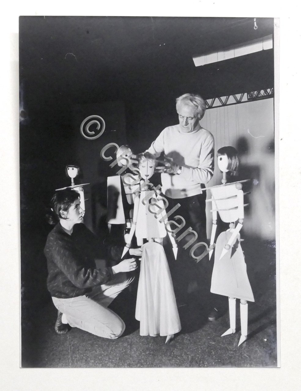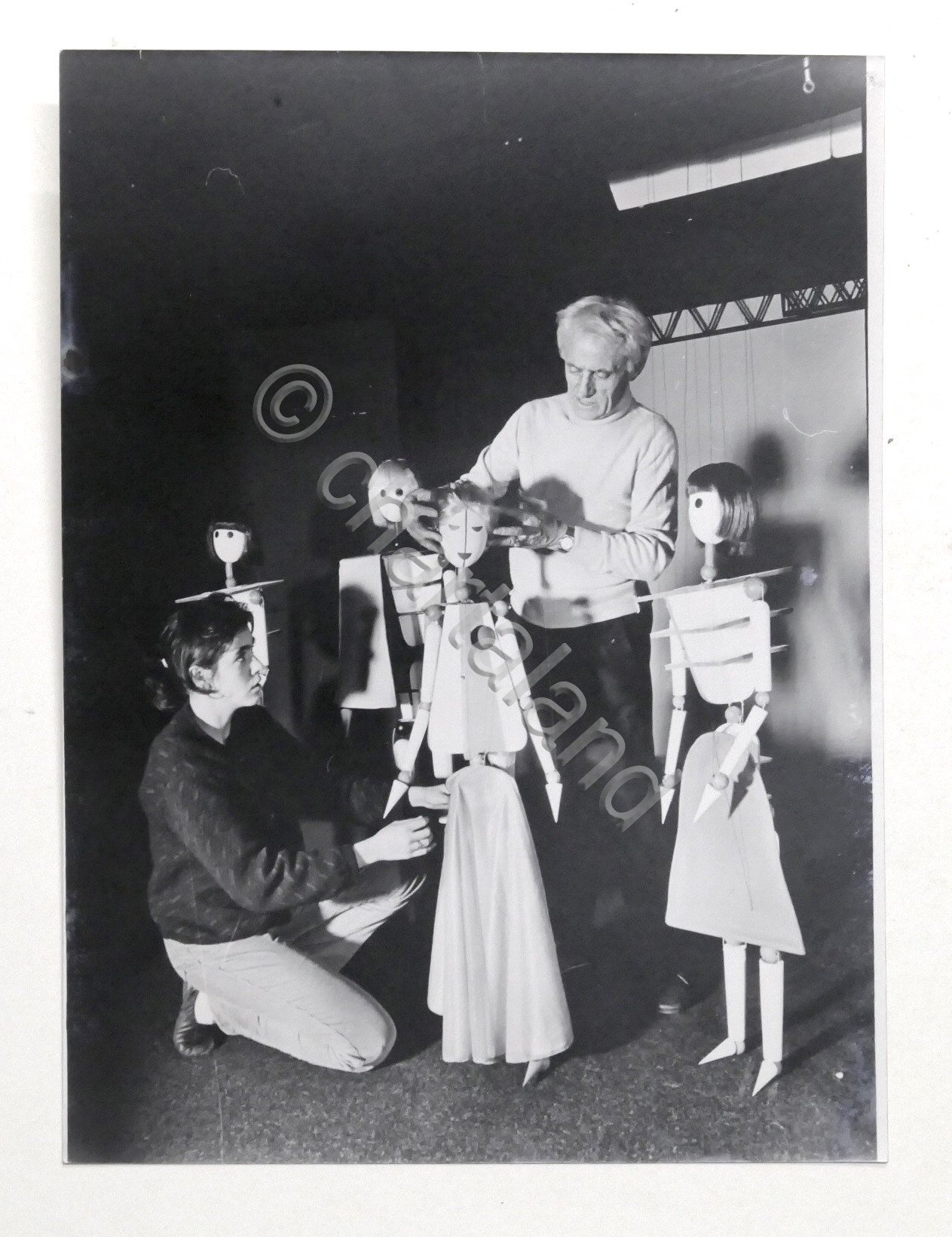 Fotografia Gianni Colla e Stefania Colla con alcuni personaggi del pittore Luigi Veronesi per lo spettacolo "Il Drago" di Schwarzburattini pittore L. Veronesi per Il Drago di Schwarz Dimensioni: 18 x 24 cm. Condizioni molto buone.