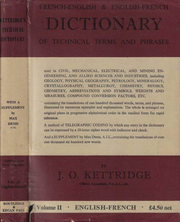 Opera incompleta, vol. II inglese-francese. Legatura in tela blu, con titoli in oro al dorso, con leggeri segni d'uso e lievi aloni chiari e con sovraccoperta con alette, brunita dal tempo, con margini consumati e strappetti alle cerniere. Tagli leggermente ingialliti; pagine salde, con ampio margine e testo a due colonne. Numero pagine 611 (numerate da 545 a 1156).