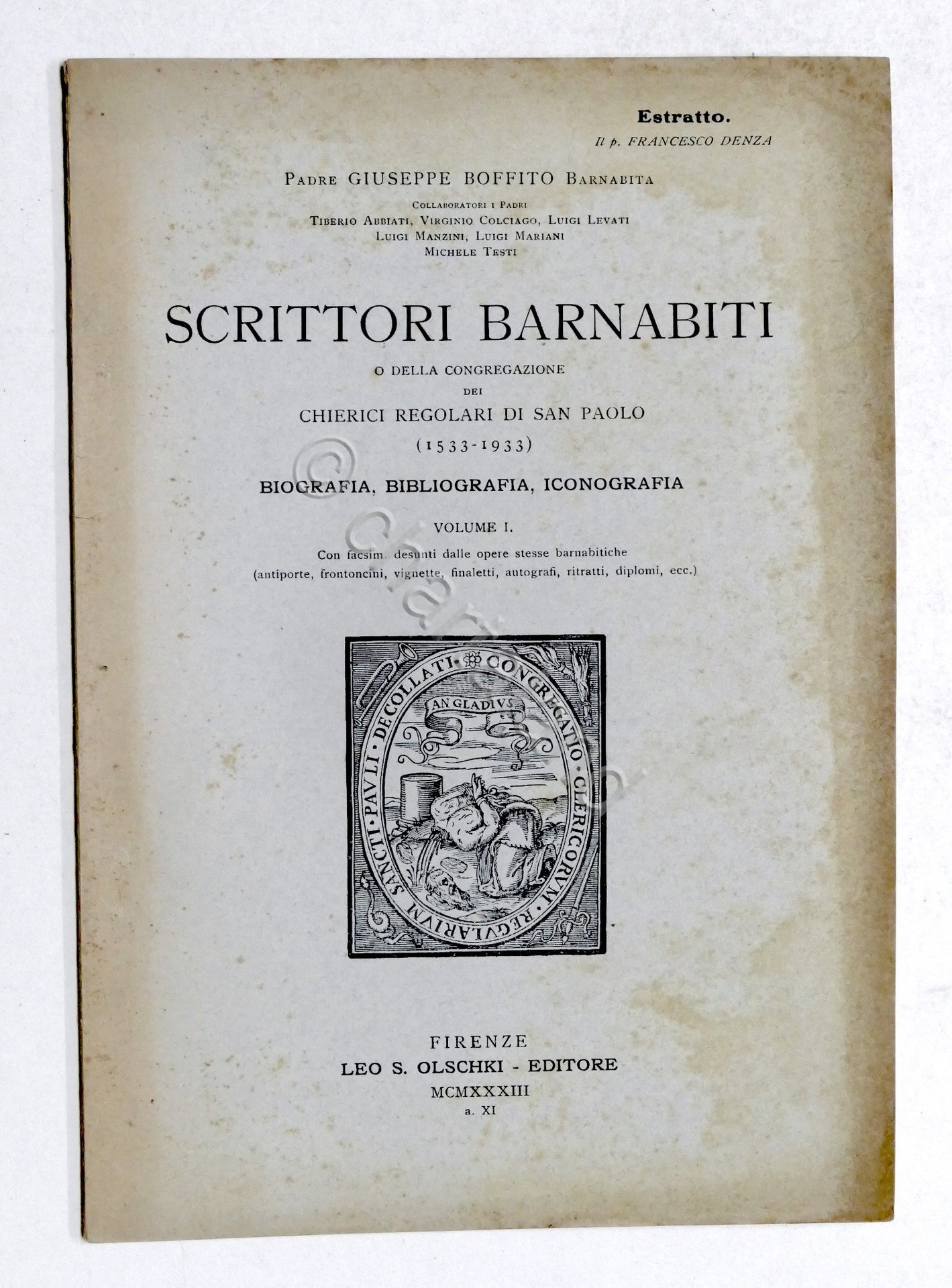 G. Boffito - Scrittori Barnabiti o della Congregazione dei Chierici regolari di SAn Paolo (1533-1933) - Biografia, bibliografia, iconografia - Estratto - Francesco Denza - Vol. I - 1933 Pag. 32 con alcune illustrazioni Copertina morbida - Testo in italiano. Condizioni molto buone. Copertina come da foto.