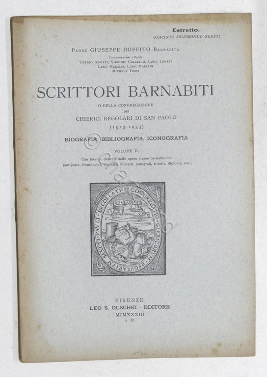 G. Boffito - Scrittori Barnabiti Biografia G. Sigismondo Gerdil Vol. III - 1933 | Libri antichi e moderni |
