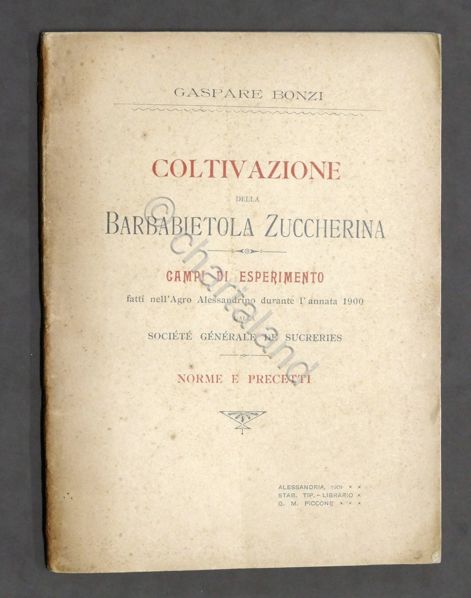 Agraria Gaspare Bonzi - Coltivazione della barbabietola zuccherina - Campi di esperimento fatti nell'Agro Allessandrino durante l'annata 1900 dalla Societè Generale de Sucreries - Norme e precetti - Alessandria, Stab. Tip. G. M. Piccone, 1901 - pag. 108. Testo in italiano. Copertina morbida. Buone condizioni. Piccole mancanze al dorso.