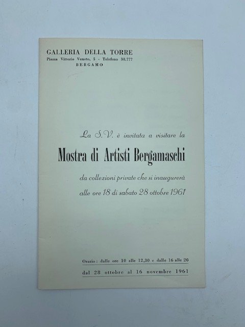 Pieghevole di 4 facciate (ciascuna facciata misura cm 14,5 x 22) con invito alla mostra di opere di artisti bergamaschi svoltasi alla Galleria Della Torre di Bergamo nel 1961. All'interno l'elenco degli artisti con i titoli delle opere. NON sono presenti illustrazioni.