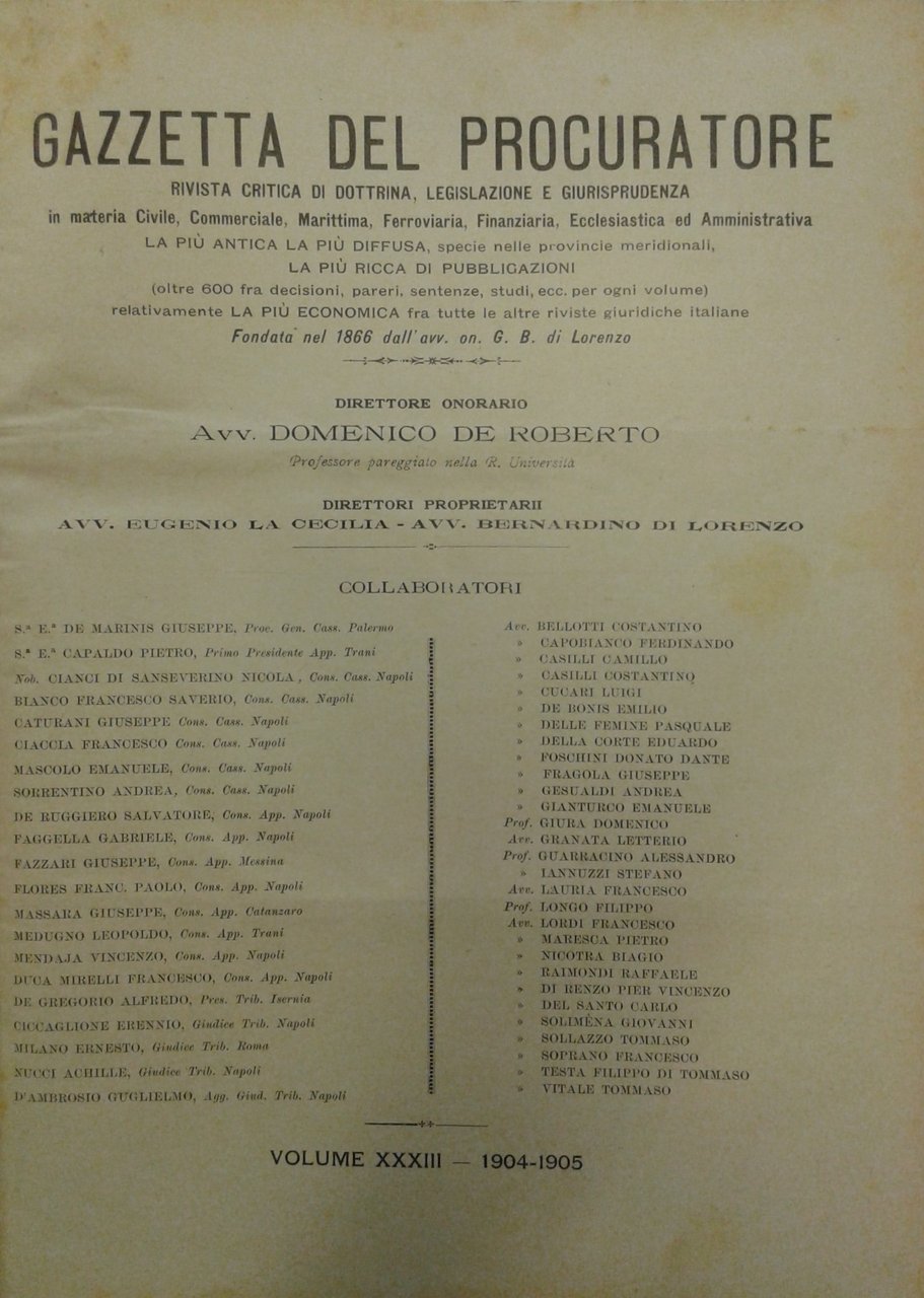 Gazzetta del Procuratore. Rivista critica di dottrina, legislazione e giurisprudenza. Diretta da Domenico De Roberto. Anno XXXIII - 1904-1905 | Libri antichi e moderni | Autori Vari