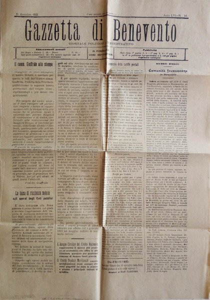 Giornale degli anni '20 in buono stato, bordo poco consunto con strappetti, fascicolo più volte piegato, inserzioni pubblicitarie in nero. N. 50, 31 dicembre 1922. anno LVI del settimanale Gazzetta di Benevento - Giornale Politico Amministrativo, direttore responsabile: Angelo D'Alessandro. Numero Pagine n. n.