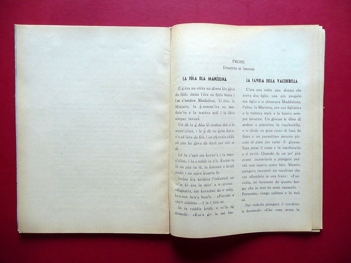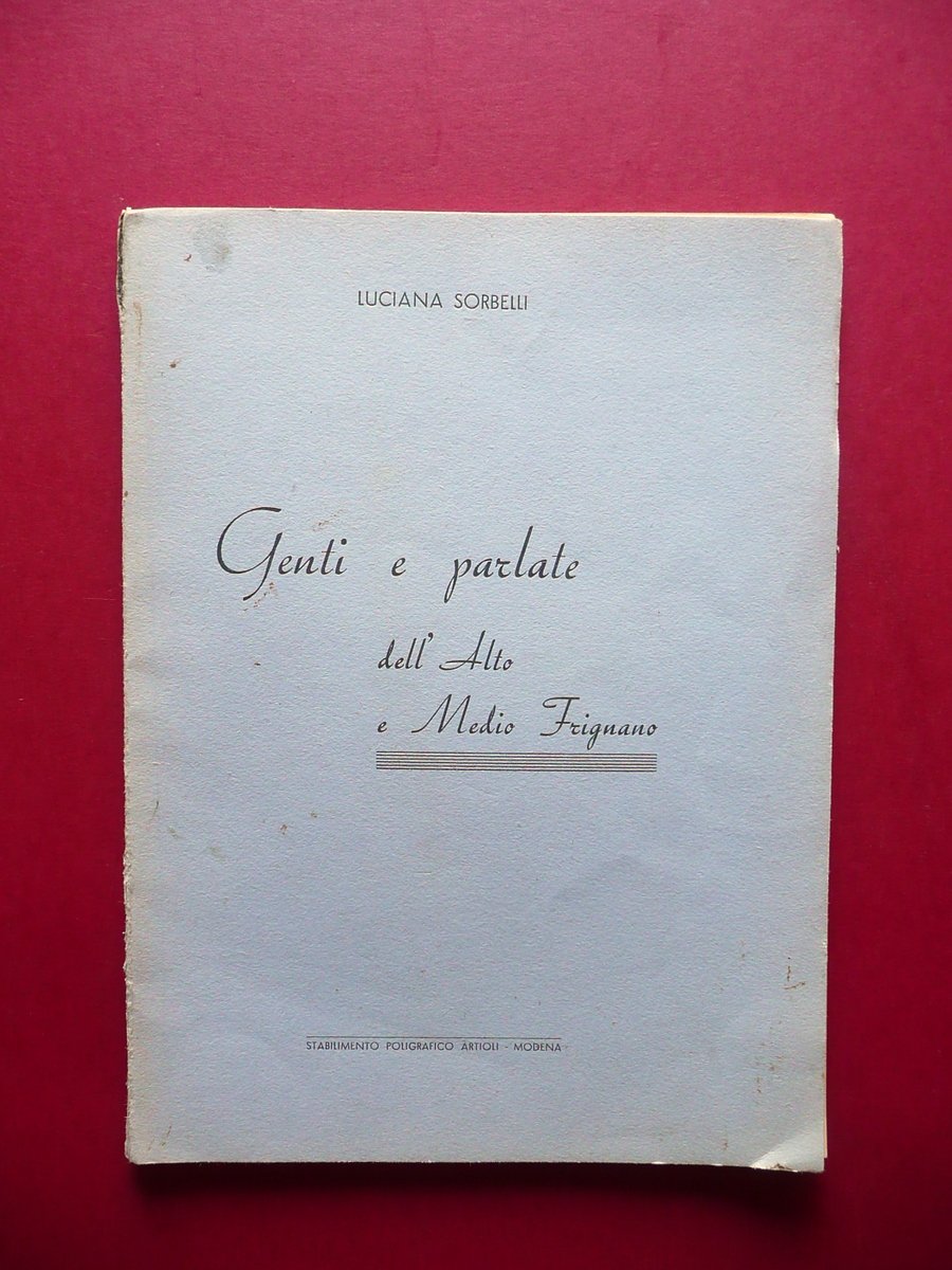 Luciana Sorbelli, Genti e parlate dell'Alto e Medio Frignano Stab. Poligrafico Artioli, Modena, s. d. (anni '30 circa); cm 21,5x16; pp. 80 pi√π una carta ripiegata al termine del testo (vedi foto). Brossura ed. Condizioni di conservazione Esemplare ben conservato con tracce d'uso, brossure con qualche minima macchietta, cuffie entrambe con un piccolo strappetto. Interni buoni con lievi accenni d'ingiallimento dovuti al tipo di carta. Interessante rassegna storica e linguistica dell'area del Frignano, con antologia di proverbi, testi dialettali, canzoni. Raro. OPEB.4393 N