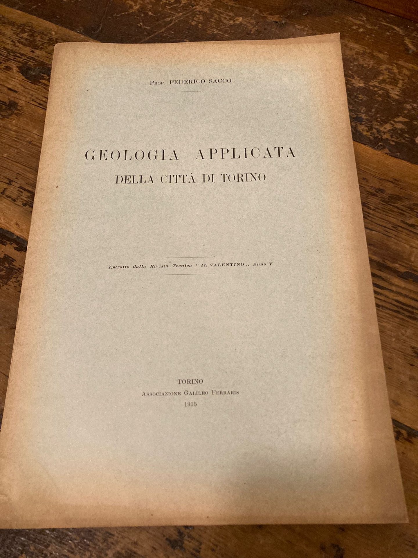 In-4° (28x19 cm), pp. 43 (1), brossura editoriale azzurra. Lievi sbiaditure marginali ai piatti ma più che buon esemplare. Cenni su gneiss, schisti, graniti, sieniti, gessi, calcari, arenarie e conglomerati, argille del sottosuolo torinese; in fine, cenni sulle acque potabili a Torino.