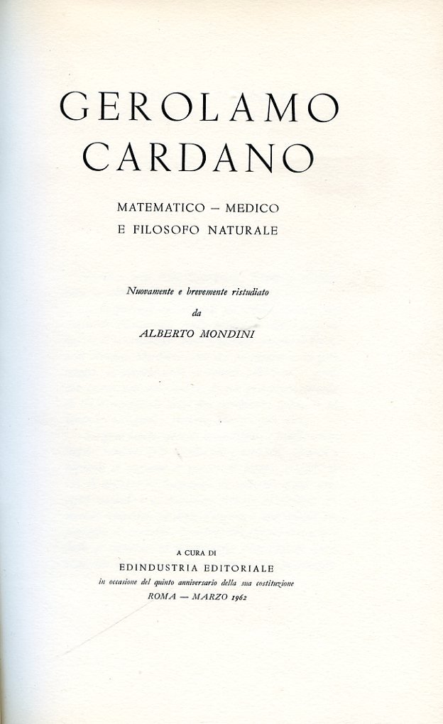 In-4°, pp.150, (4), legatura editoriale m. pergamena con titolo oro al dorso. Numerose tavv. in b.n. f.t., tra cui una all'antiporta con ritratto di Cardano, riproducenti antiche stampe, incisioni tratte da libri di Cardano, frontespizi e pagine di prime edizioni di sue opere. Edizione non venale di soli 500 esemplari su carta a mano appositamente fabbricata dalle Cartiere Magnani di Pescia; pubblicazione occasionata dal quinto anniversario della costituzione di Edindustria Editoriale. Bibliografia finale. Allegatp un cartoncino a stampa in data dicembre 1962: 'Fausto Bima che di Edindustria è stato amministratore delegato per i primi cinque anni di vita ha realizzato il presente volume a ricordo e a celebrazione del quinquennio della Società'.