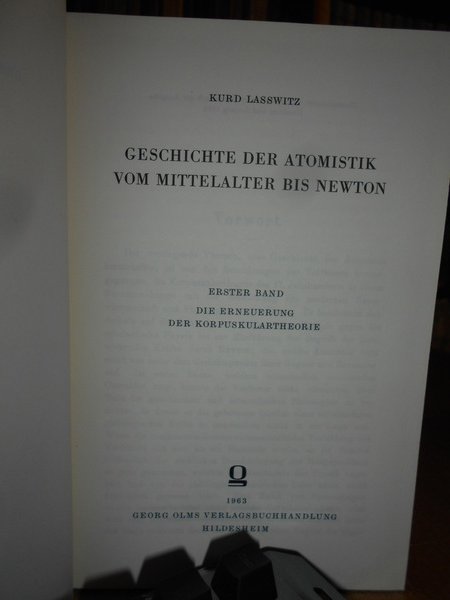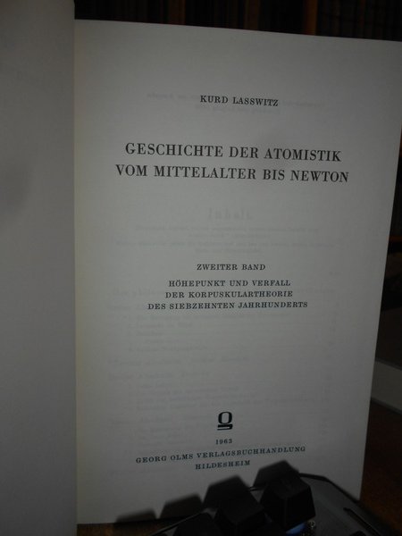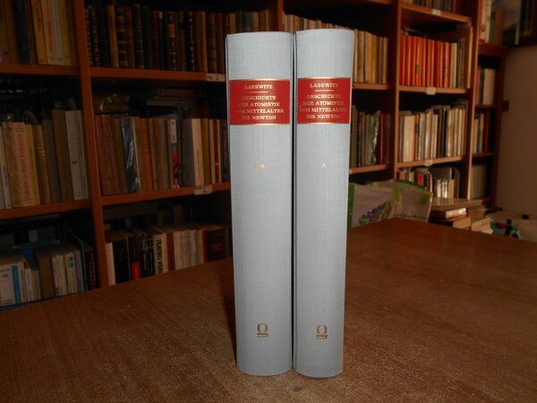 KURD LASSWITZ. Hildesheim, Georg Olms Verlagsbuchhandlung, 1963. Geschichte der Atomistik vom Mittelalter bis Newton. 2 volumi in-8°, tela edit. con titoli in oro ai dorsi. Erster Band. Die Erneuerung der Korpuskulartheorie. xii, 518 pp.; Zweiter Band. Hohepunkt und verfall der Korpuskulartheorie des Siebzehnten Jahrhunderts. viii, 609 pp. Ristampa dell' edizione 1890. Come nuovi. Uff. C - II - 3