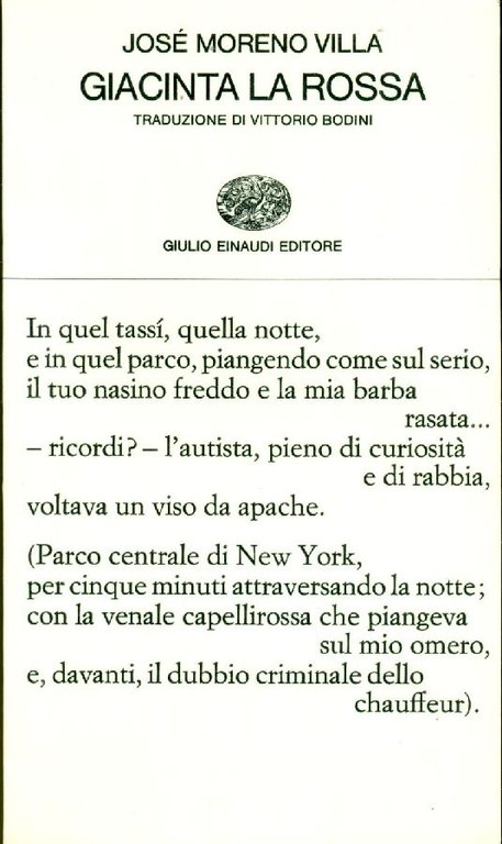 Introduzione e traduzione di Vittorio Bodini . 16mo. pp. 112. . Ottimo (Fine). . Prima edizione italiana (First Italian Edition). Dizionario della letteratura mondiale del 900 [Galati, 1980] Licinio Galati Francesco (a cura di), Dizionario della letteratura mondiale del 900. Roma, Edizioni Paoline, 1980.