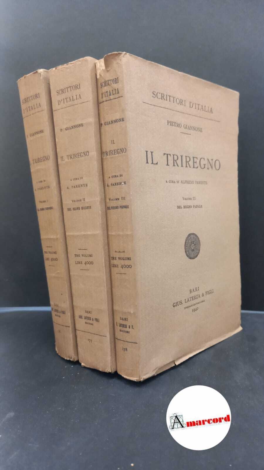 1005 Giannone, Pietro Giannone, Pietro. , and Parente, Alfredo. �Il �Triregno 3 voll. Bari G. Laterza, 1940. , G. Laterza 1940 italiano, in ottavo circa 900 complessive 16465
