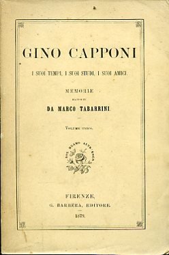 In-8°, pp. VII, 376, brossura editoriale con titolo entro bordura. Ritratto litografico del Capponi all'antiporta. Perfetto stato. Prima edizione di questa biografia del celebre letterato, storico e politico fiorentino che presiedette il governo toscano nel 1848. L'opera è preziosa anche nel ricostruire le relazioni del Capponi con personalità come Giacomo Leopardi (che gli indirizzò la celebre Palinodia), Pietro Giordani, Pietro Colletta, Guglielmo Pepe, Giovanni Battista Niccolini, Raffaello Lambruschini, Giuseppe Giusti, Carlo Matteucci, Alessandro Manzoni, Massimo d'Azeglio, Federico Confalonieri, etc. Il Tabarrini (Pomarance, 1818-Roma, 1898), patriota e poligrafo, fu socio della Crusca dal 1856, Senatore dal 1871 e Presidente del Consiglio di Stato dal 1881. Ricoprì anche la presidenza dell'Istituto Storico Italiano e, come studioso, lasciò scritti di varia storiografia ed edizioni di volumi del Giusti, del D'Azeglio, del Ricasoli e del Capponi medesimo. Cfr. U. Balzani, Commemorazione di M. T., in Archivio storico italiano, 1891, 1.