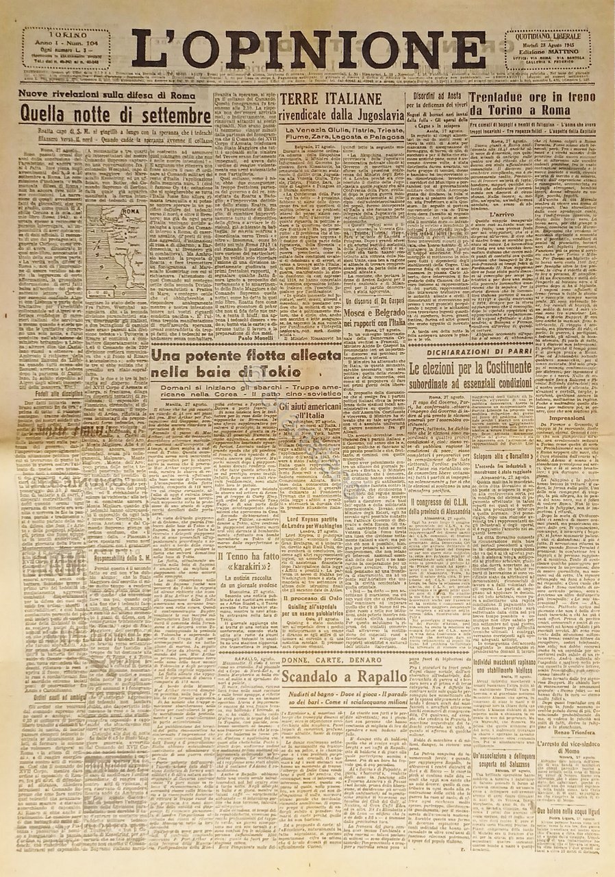 Giornale - L'Opinione N. 104 - 1945 Terre Italiane rivendicate dalla Jugoslavia Testo in lingua italiana. Pagine 2 Condizioni discrete/buone con segni del tempo come da foto.