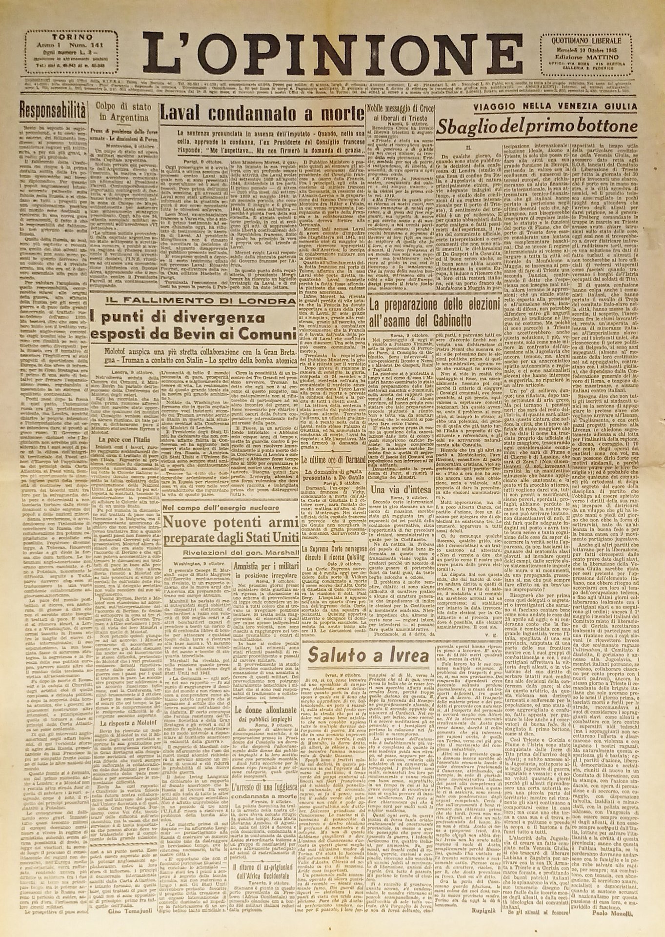 Giornale - L'Opinione N. 141 - 1945 Laval condannato a morte | Libri antichi e moderni |