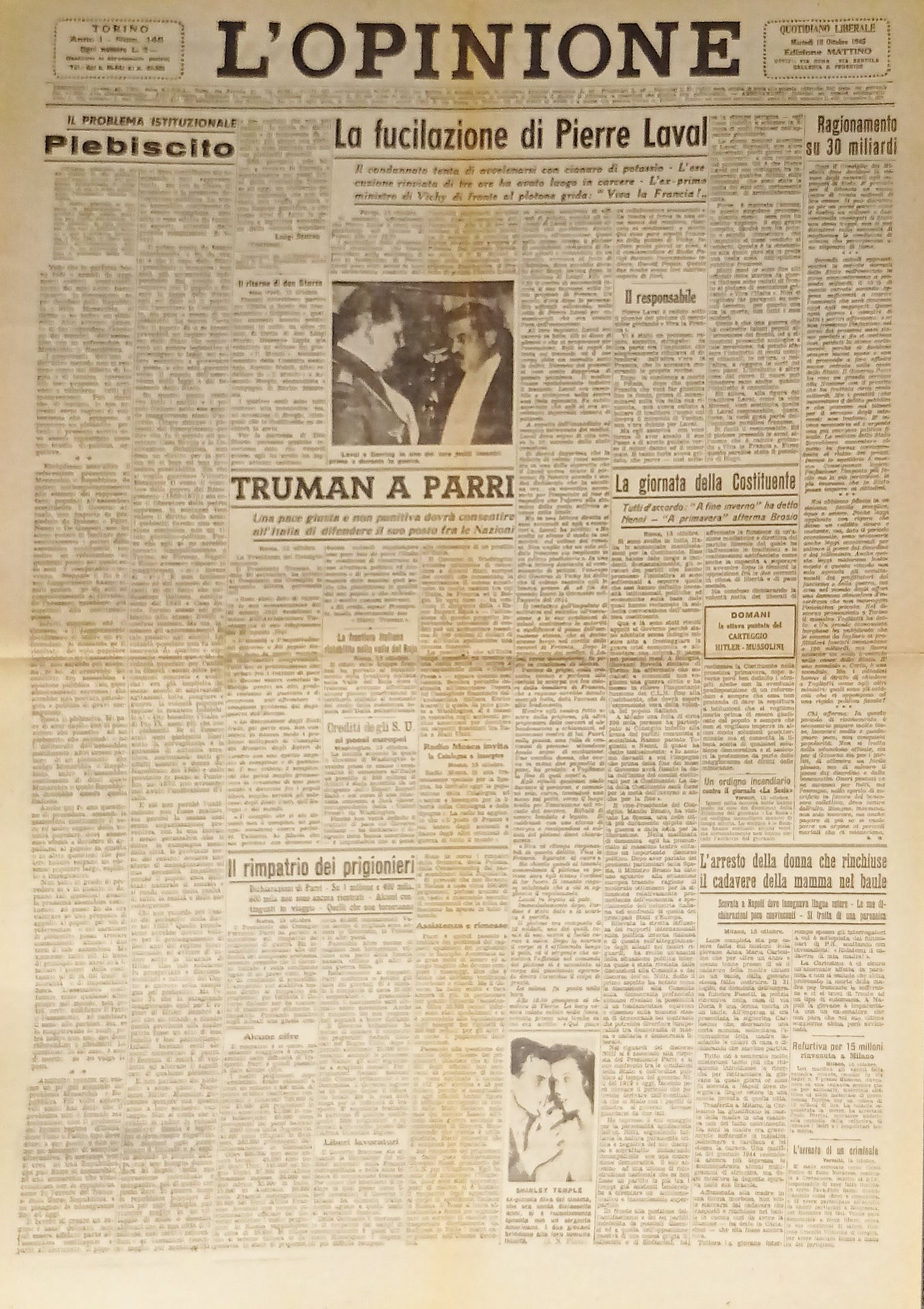 Giornale - L'Opinione N. 146 - 1945 La fucilazione di Pierre Laval