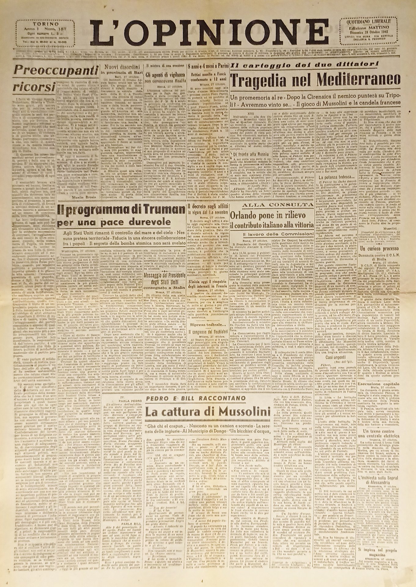 Giornale - L'Opinione N. 157 - 1945 Tragedia nel Mediterraneo Testo in lingua italiana. Pagine 2 Condizioni discrete/buone con segni del tempo come da foto.