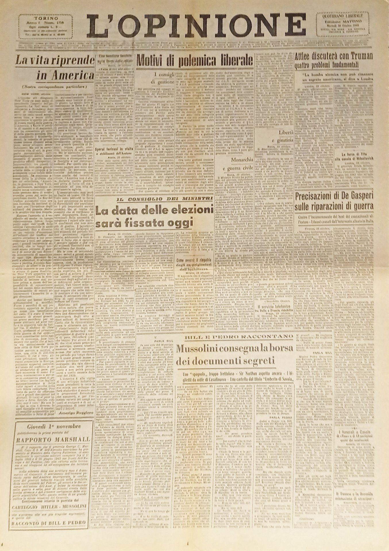 Giornale - L'Opinione N. 158 - 1945 La vita riprende in America Testo in lingua italiana. Pagine 2 Condizioni discrete/buone con segni del tempo come da foto.