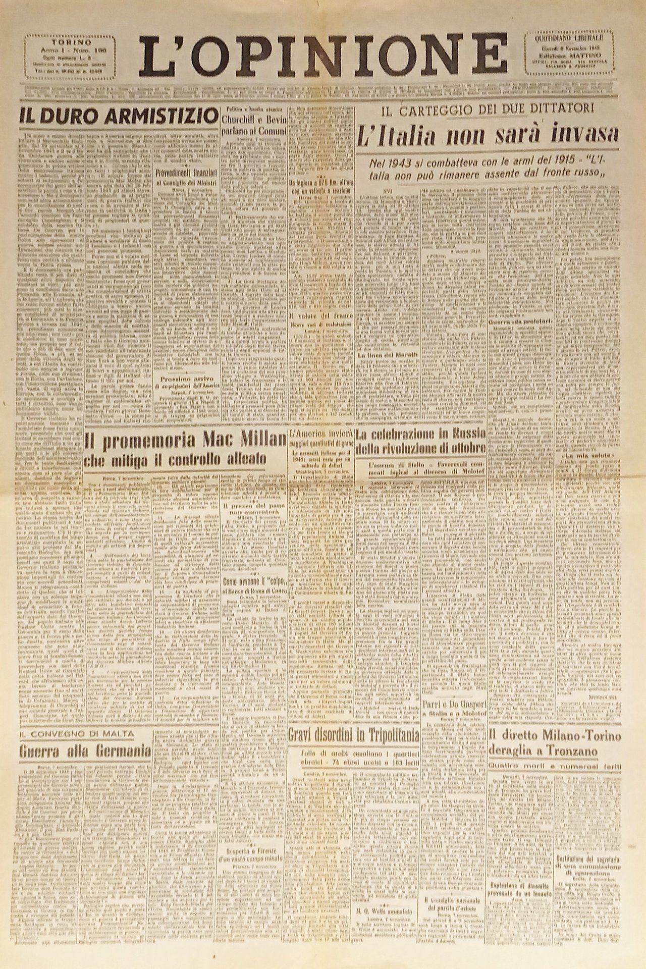 Giornale - L'Opinione N. 166 - 1945 L'Italia non sarà invasa Testo in lingua italiana. Pagine 2 Condizioni discrete/buone con segni del tempo come da foto.