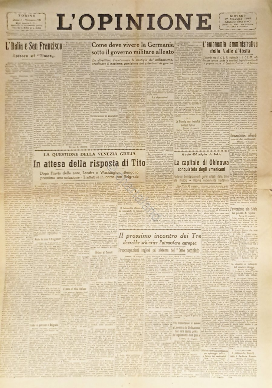 Giornale - L'Opinione N. 19 - 1945 Come deve vivere la Germania Testo in lingua italiana. Pagine 2 Condizioni discrete/buone con segni del tempo come da foto.